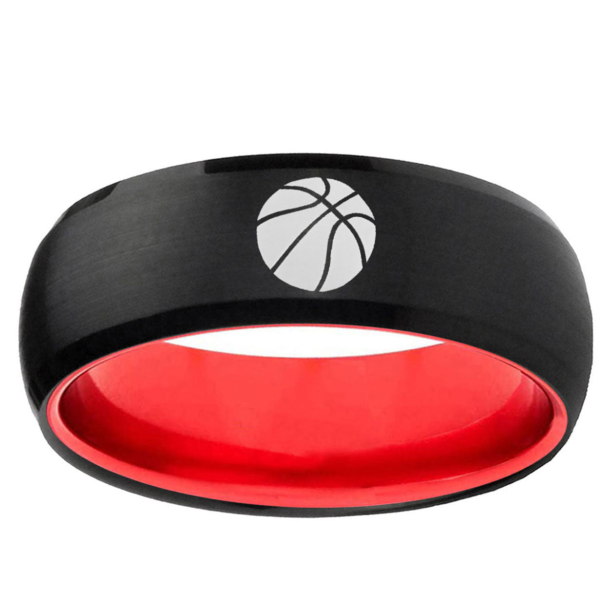 Intruding 8mm Basketball Dome Black And Red Tungsten Carbide Mens Promise Ring . Offer in men wedding band in 8mm band width Black And Red plated finished from size 7 to 14