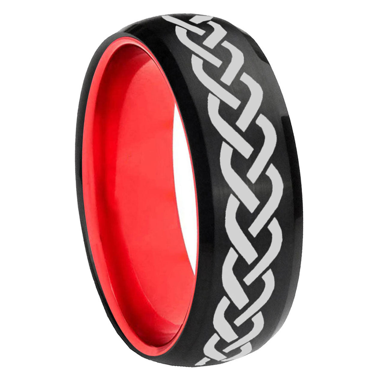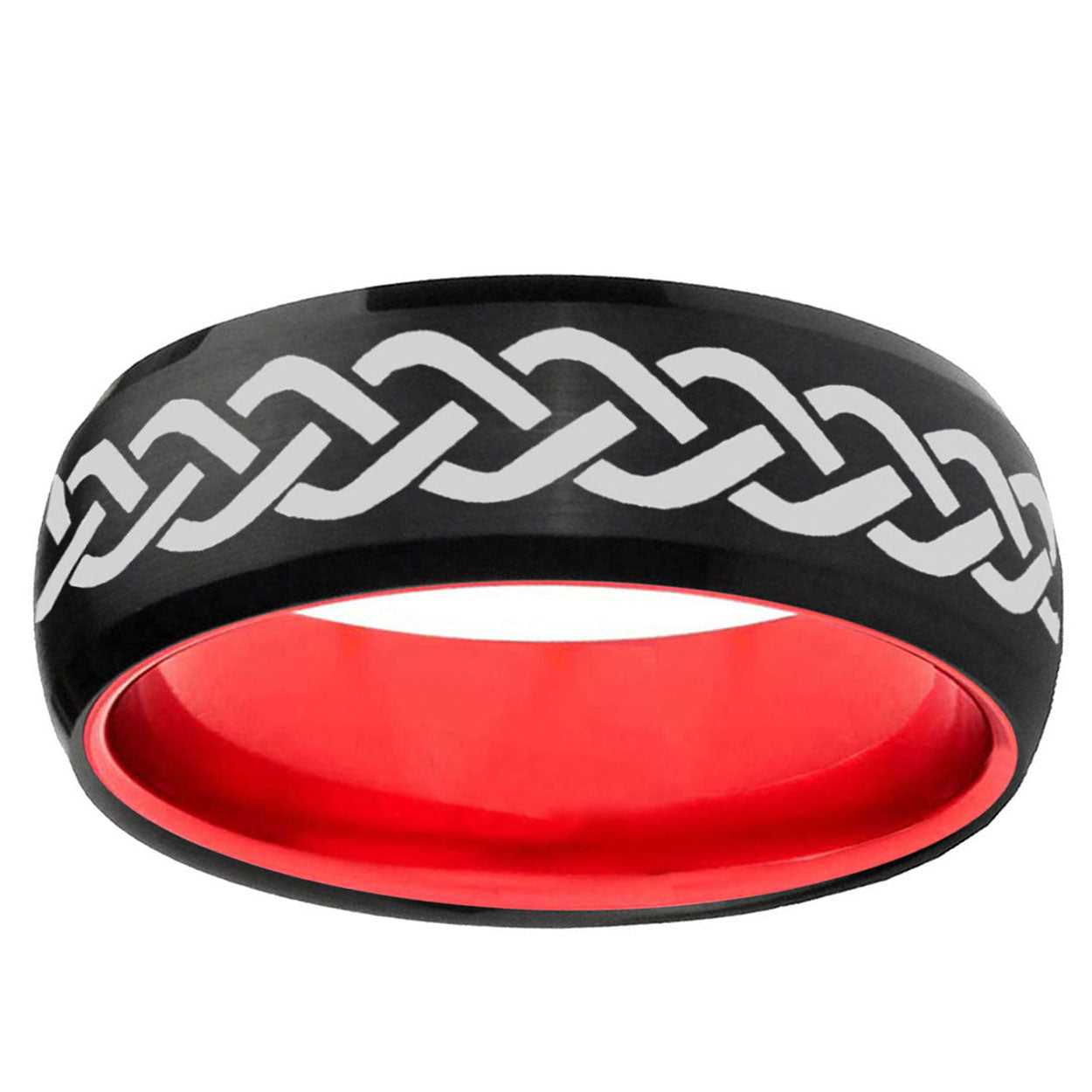 Intruding 8mm Laser Celtic Knot Dome Black And Red Tungsten Carbide Men's Wedding Ring . Offer in men wedding band in 8mm band width Black And Red plated finished from size 7 to 14
