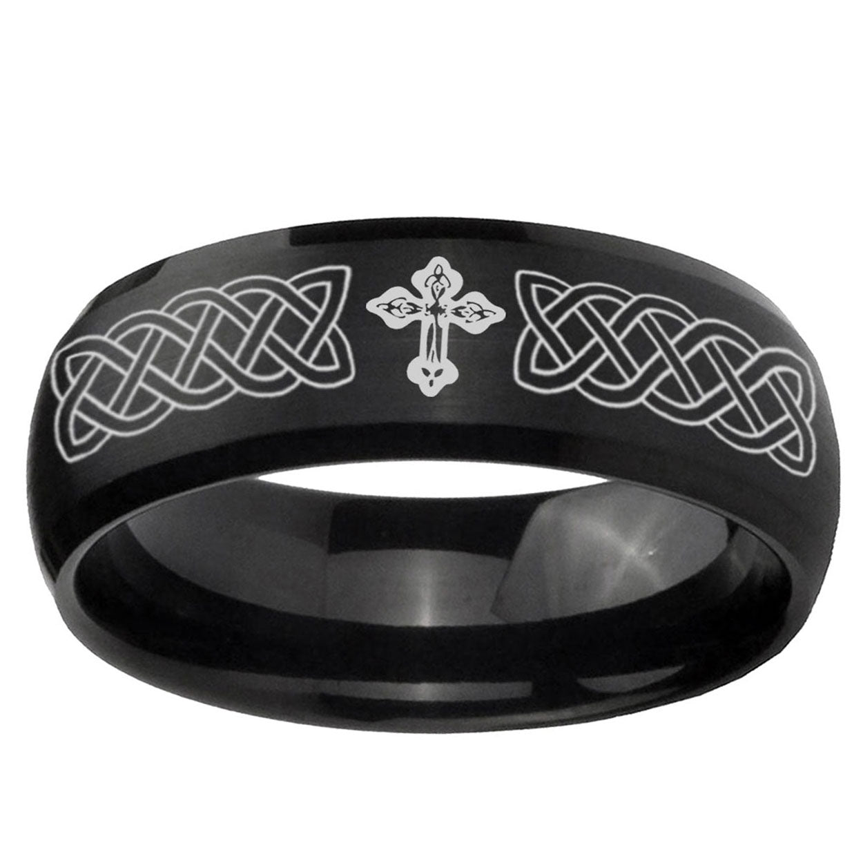 Intruding 5, 8mm Celtic Cross Dome Brush Black Tungsten Carbide Men's Promise Rings . Offer in both 5mm and 8mm band width brush black plated finished from size 4 to 14