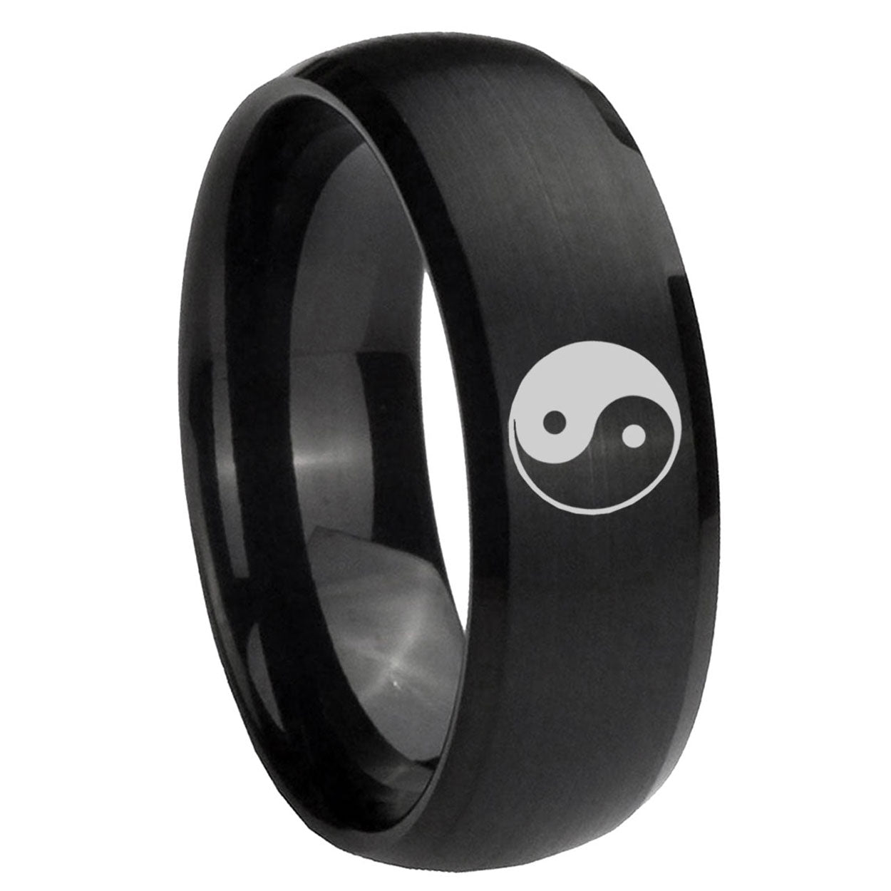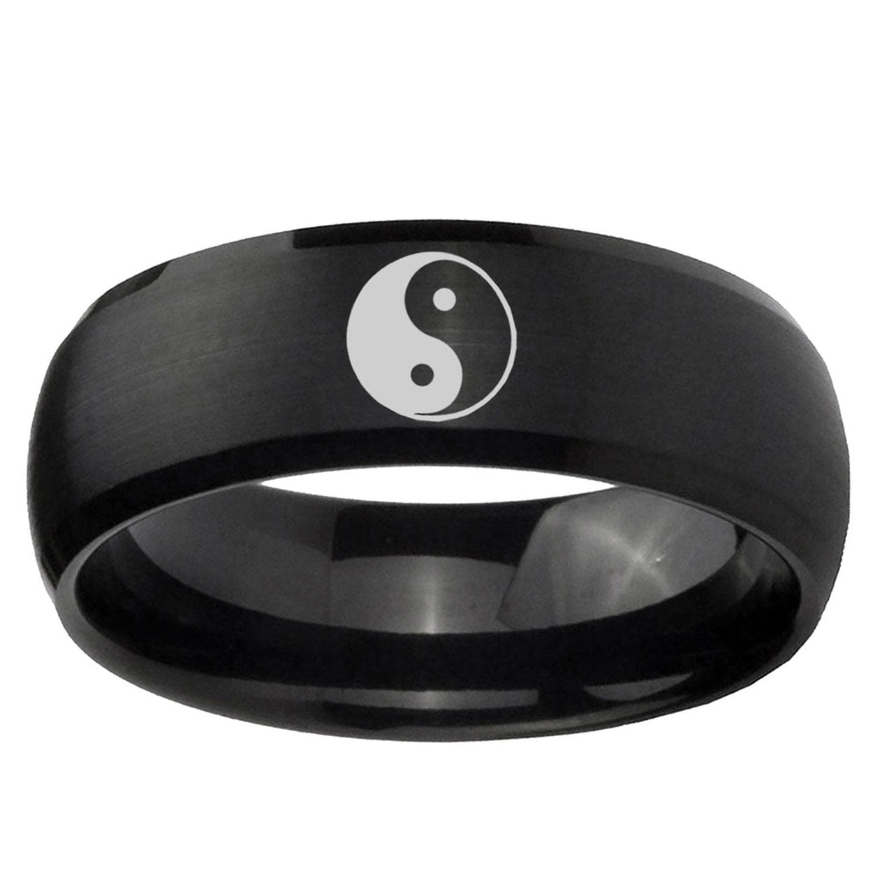 Intruding 5, 8mm Yin Yang Dome Brush Black Tungsten Carbide Mens Wedding Band . Offer in both 5mm and 8mm band width brush black plated finished from size 4 to 14