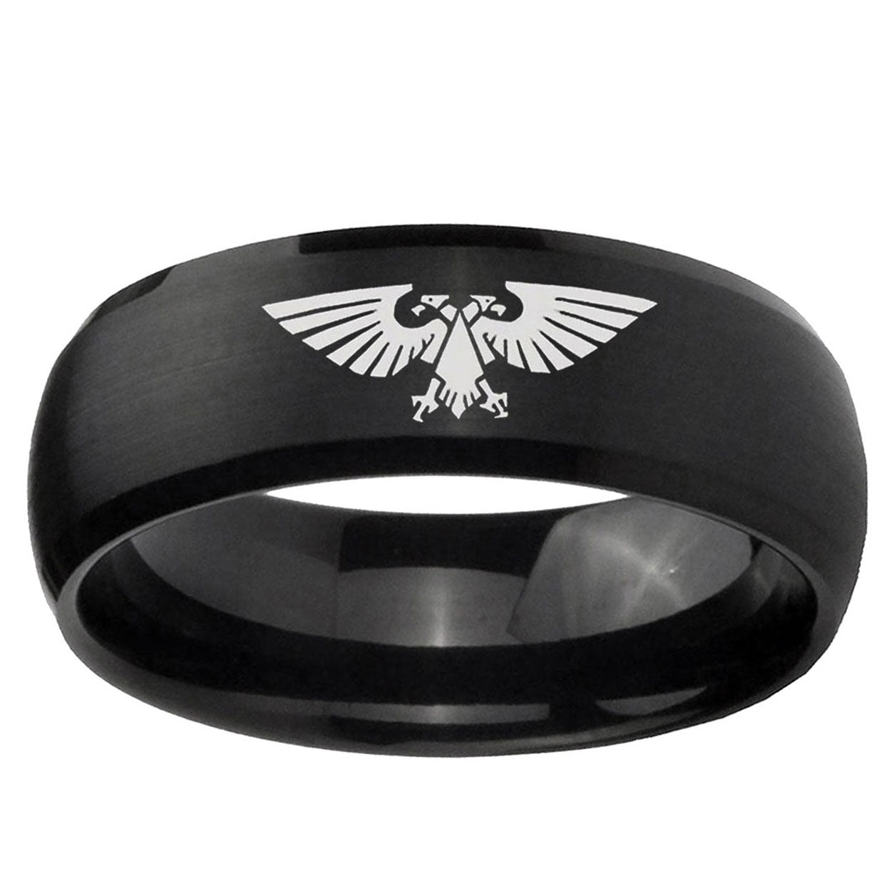 Intruding 5, 8mm Aquila Dome Brush Black Tungsten Carbide Mens Engagement Ring . Offer in both 5mm and 8mm band width brush black plated finished from size 4 to 14