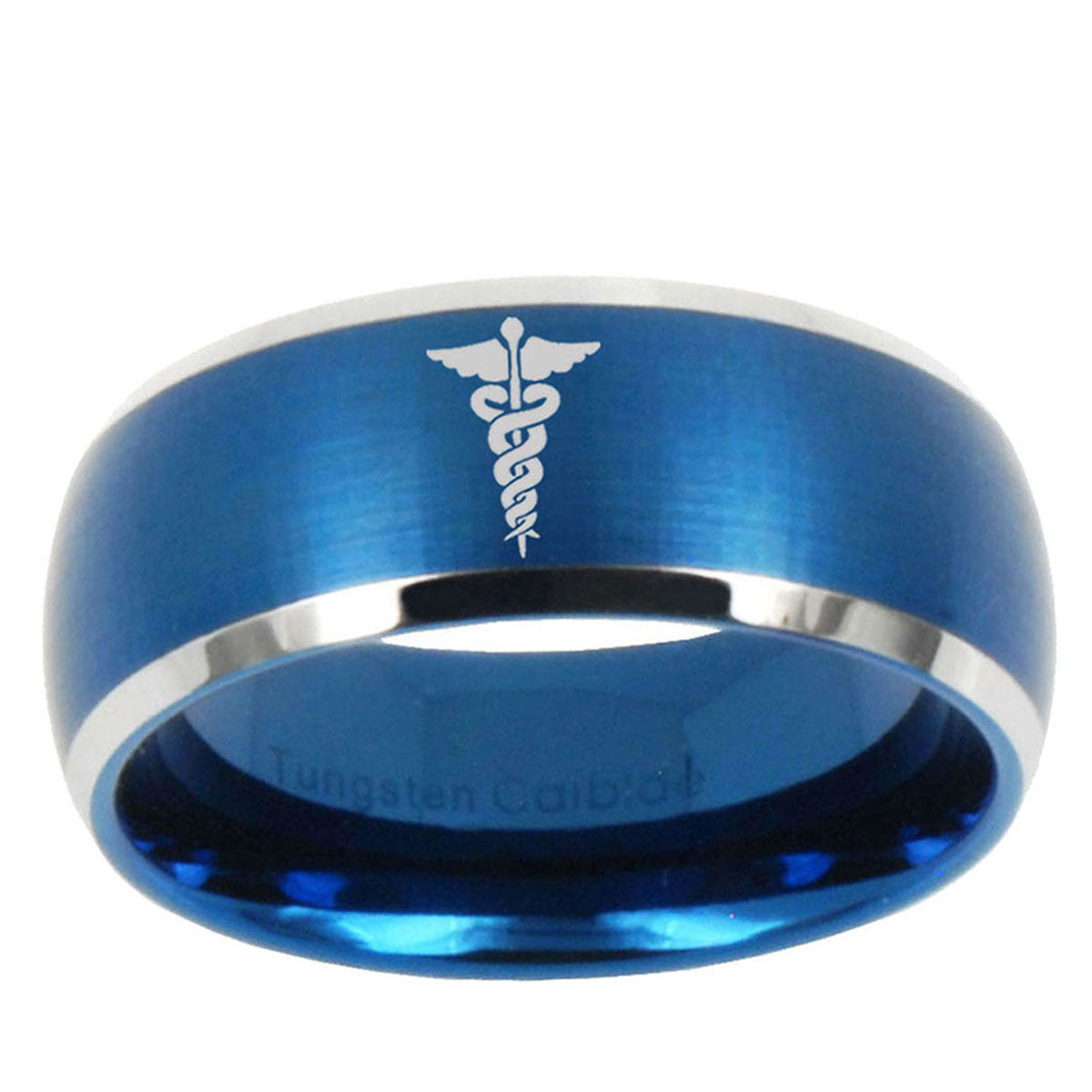 Intruding 5, 8mm Medical Symbol Dome Brushed Blue 2 Tone Tungsten Wedding Band Ring . Offer in both 5mm and 8mm band width brushed blue 2 tone plated finished from size 4 to 14