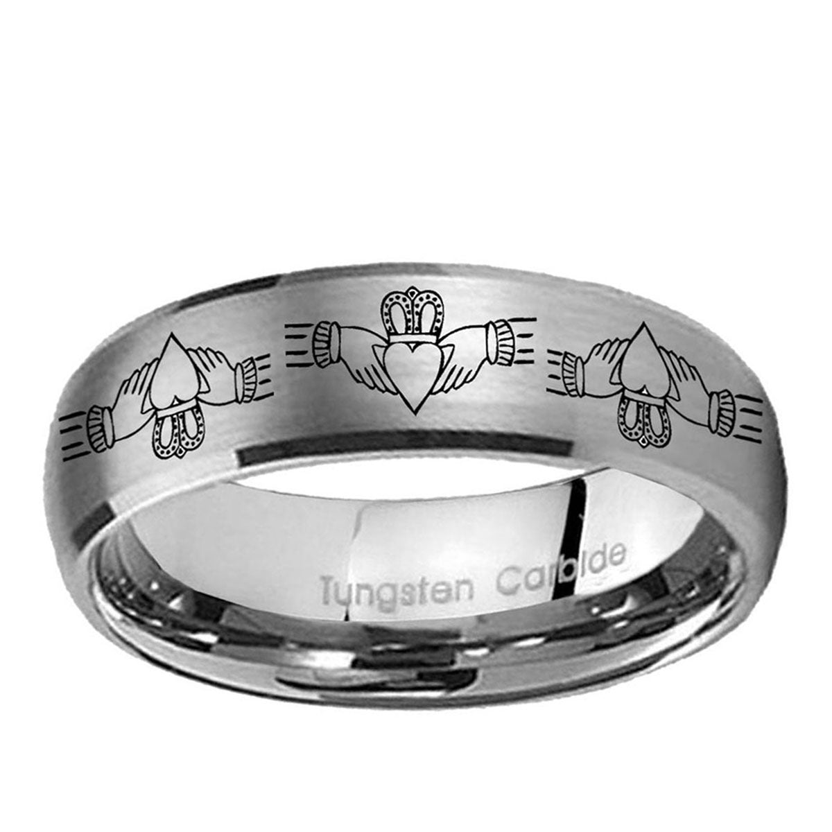 Intruding 5, 8mm Irish Claddagh Dome Brushed Tungsten Carbide Mens Ring Personalized . Offer in both 5mm and 8mm band width matte grey finished from size 4 to 14