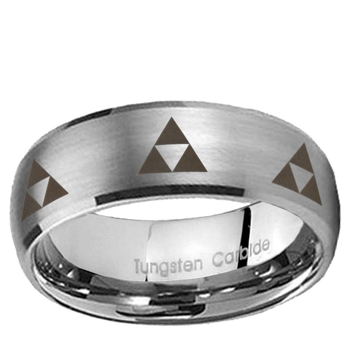 Intruding 5, 8mm Multiple Zelda Triforce Dome Brushed Tungsten Carbide Mens Ring . Offer in both 5mm and 8mm band width matte grey finished from size 4 to 14