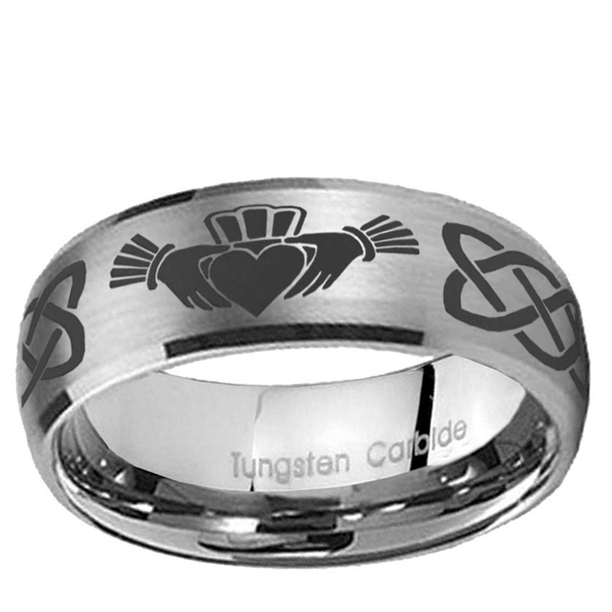 Intruding 5, 8mm Irish Claddagh Dome Brushed Tungsten Carbide Wedding Band Ring . Offer in both 5mm and 8mm band width matte grey finished from size 4 to 14