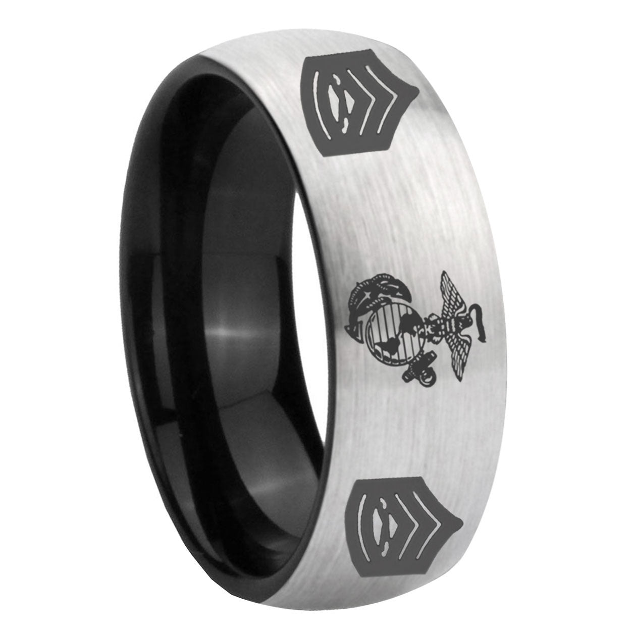 Intruding 6, 8mm Marine Army Sergeant Dome Gray And Black Tungsten Carbide Custom Ring for Men . Offer in both 6mm and 8mm band width Gray And Black plated finished from size 5 to 14