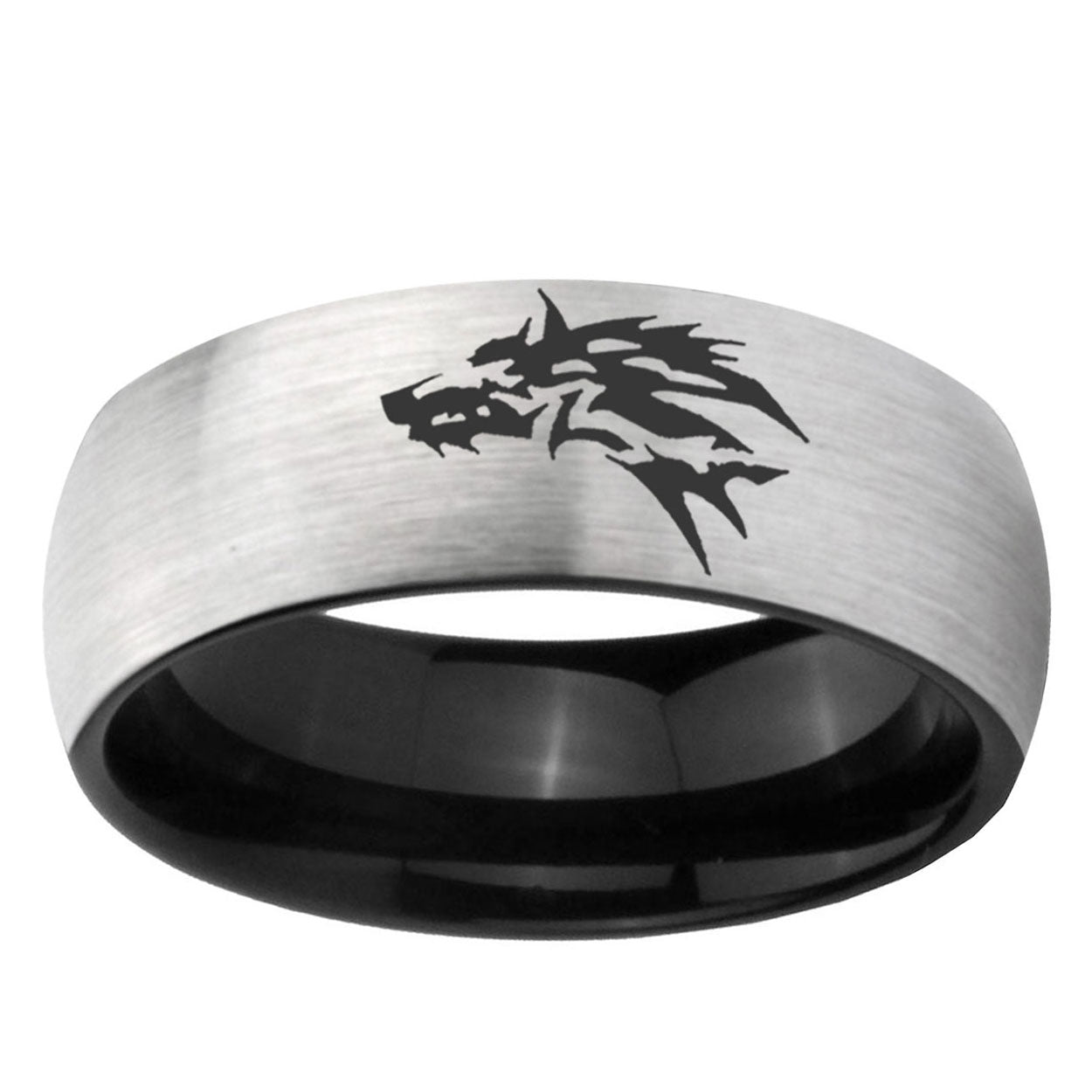 Intruding 6, 8mm Wolf Dome Gray And Black Tungsten Wedding Band . Offer in 8mm band width Gray And Black plated finished from size 5 to 14