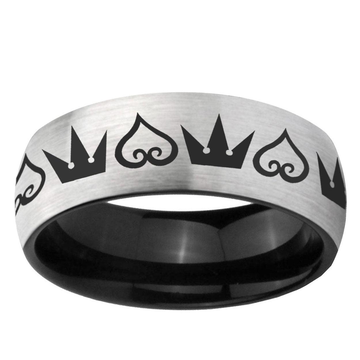 Intruding 6, 8mm Hearts and Crowns Dome Gray And Black Tungsten Carbide Mens Ring Personalized . Offer in both 6mm and 8mm band width Gray And Black plated finished from size 5 to 14