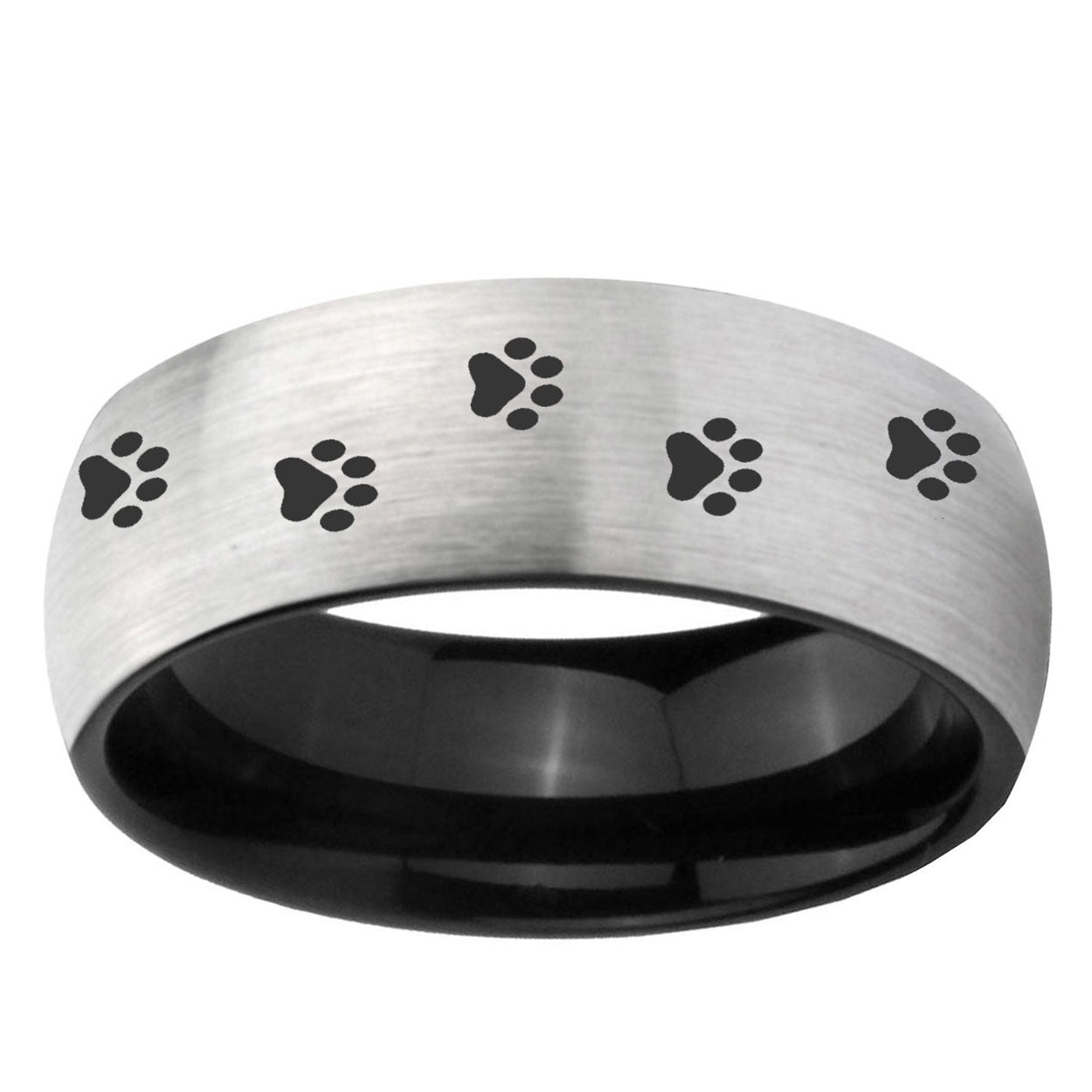 Intruding 6, 8mm Paw Print Design Dome Tungsten Carbide Gray And Black Wedding Ring . Offer in both 6mm and 8mm band width Gray And Black plated finished from size 5 to 14