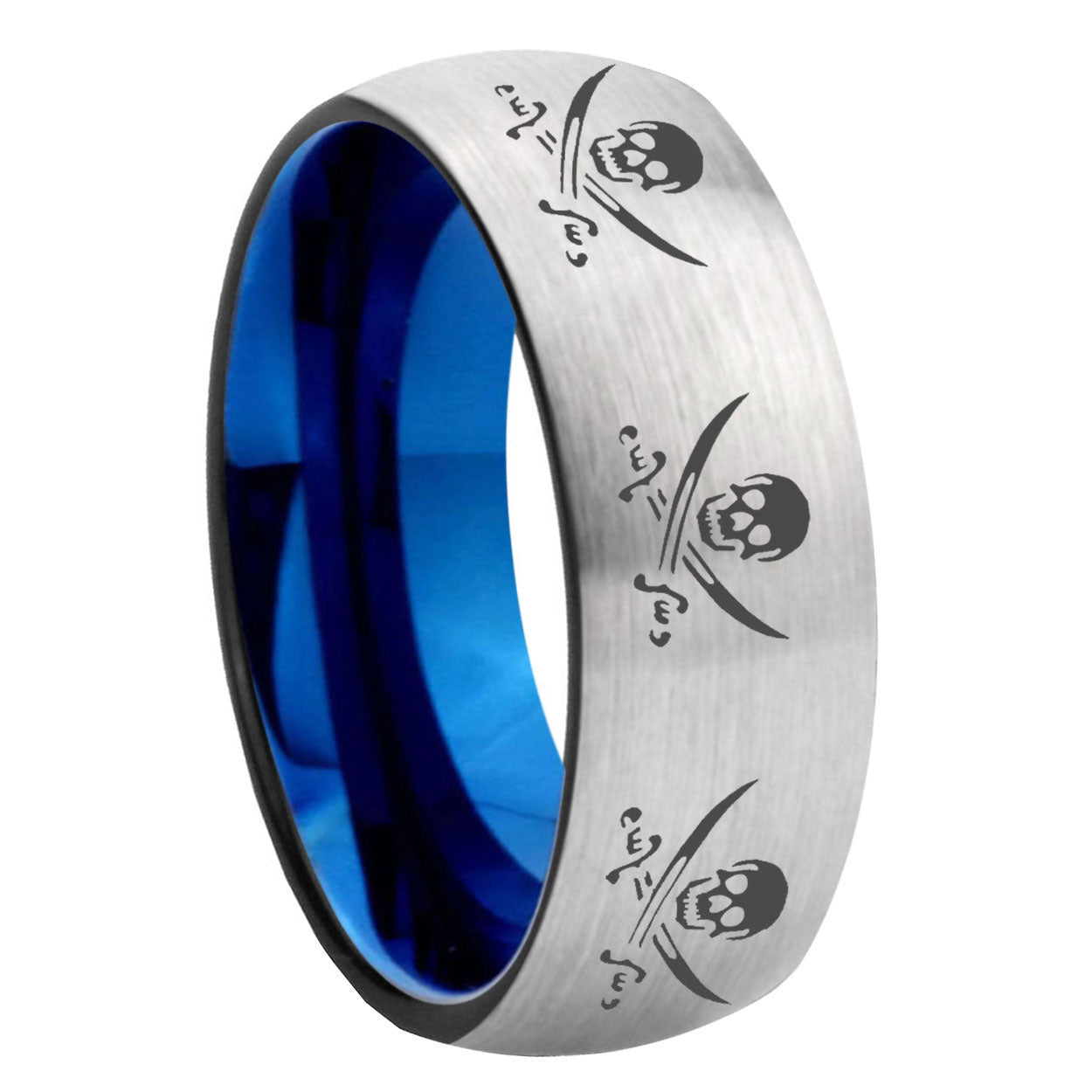 Intruding 6, 8mm Multiple Skull Pirate Dome Gray And Blue Tungsten Carbide Promise Ring . Offer in both 6mm and 8mm band width gray and blue plated finished from size 5 to 14