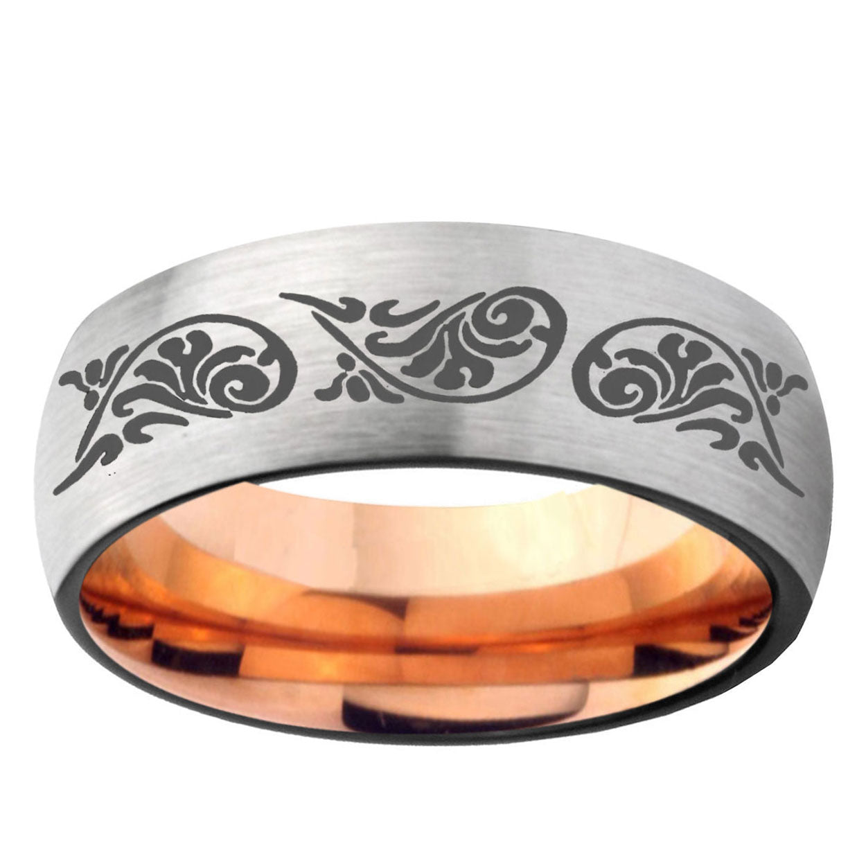 Intruding 6, 8mm Etched Tribal Pattern Dome Gray And Rose Gold Tungsten Carbide Rings for Men . Offer in both 6mm and 8mm band width gray and rose gold plated finished from size 5 to 14