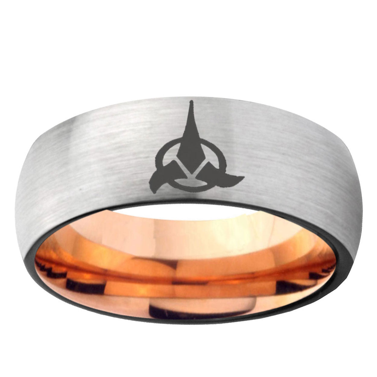 Intruding 6, 8mm Klingon Dome Gray And Rose Gold Tungsten Carbide Custom Ring for Men . Offer in both 6mm and 8mm band width gray and rose gold plated finished from size 5 to 14