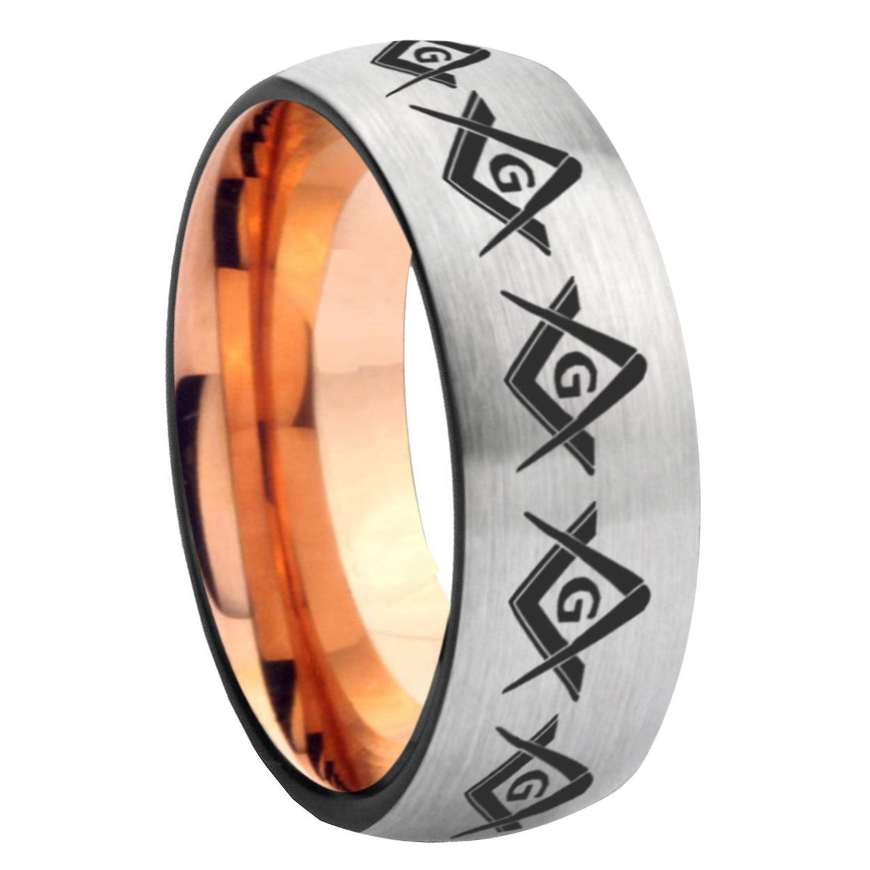 Intruding 6, 8mm Masonic Square and Compass Dome Gray And Rose Gold Tungsten Carbide Mens Anniversary Ring . Offer in both 6mm and 8mm band width gray and rose gold plated finished from size 5 to 14