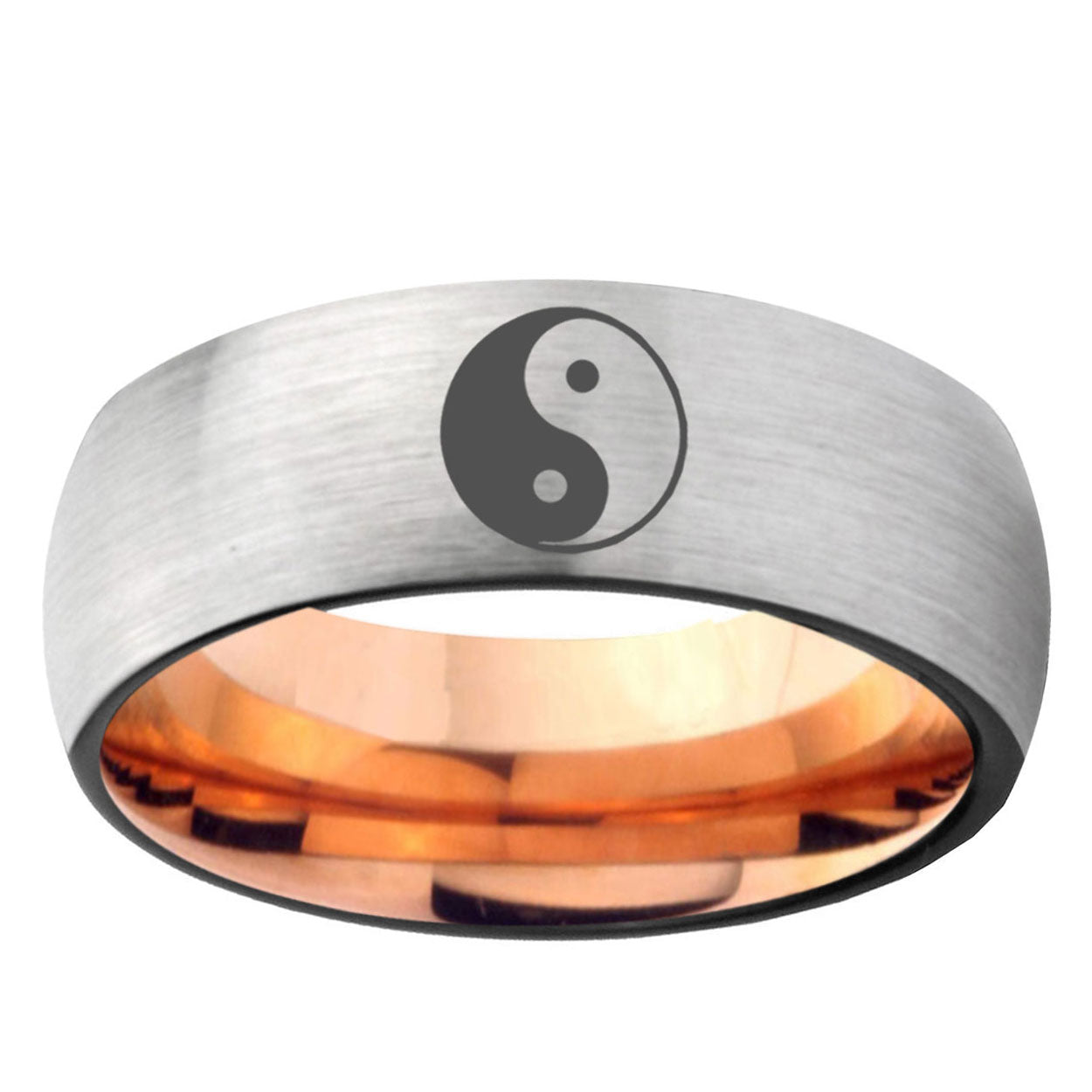Intruding 6, 8mm Yin Yang Dome Tungsten Carbide Rose Gold Anniversary Ring . Offer in 8mm band width silver and rose gold plated finished from size 5 to 14