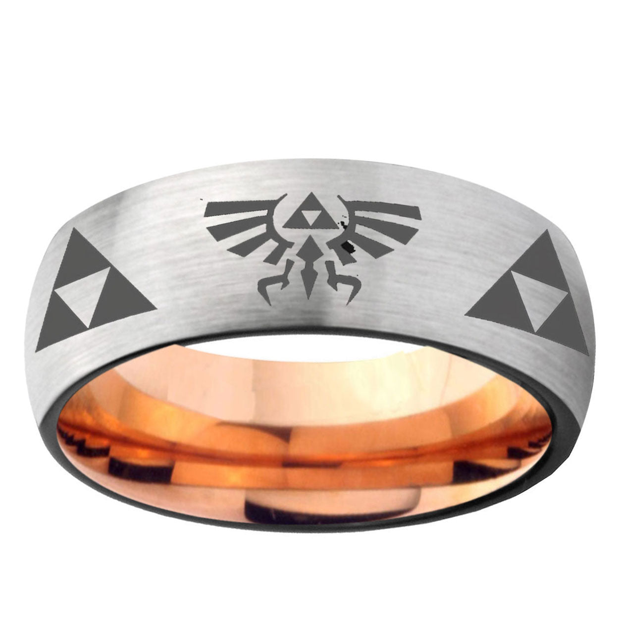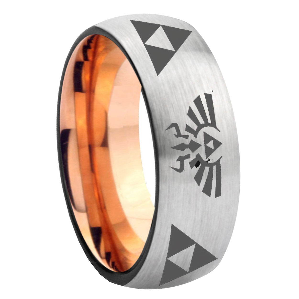 Intruding 6, 8mm Legend Triforce Zelda Dome Tungsten Carbide Rose Gold Anniversary Ring . Offer in both 5mm and 8mm band width silver and rose gold plated finished from size 5 to 14
