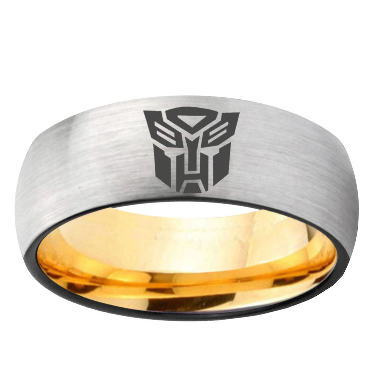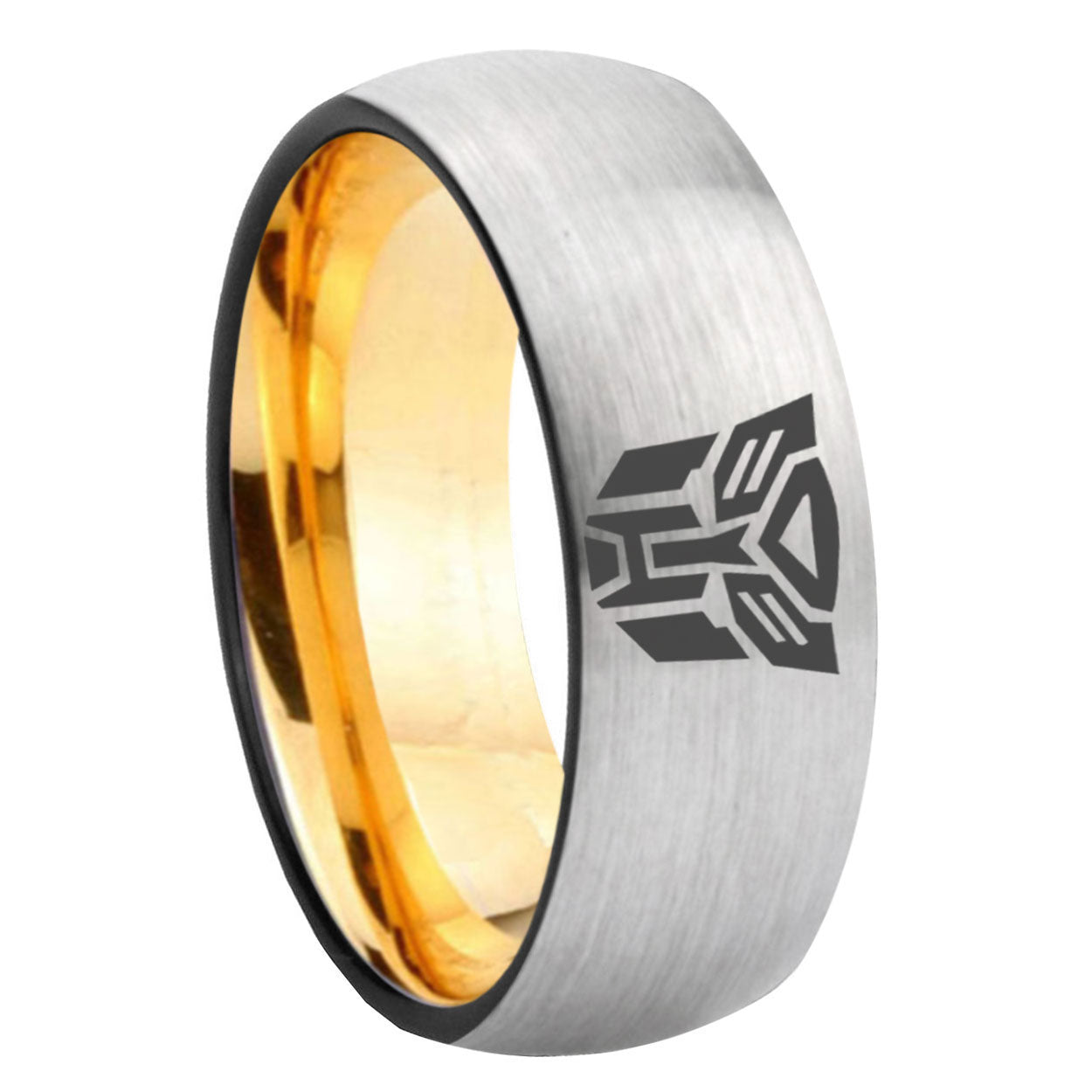Intruding 8mm Transformers Autobot Dome Gold Silver Custom Tungsten Rings . Offer in 8mm band width grey and gold plated finished from size 7 to 14
