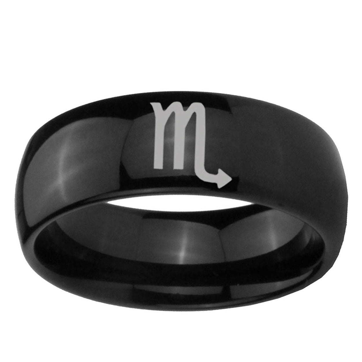 Intruding 5, 8mm Scorpio Horoscope Dome Black Tungsten Carbide Mens Bands Ring . Offer in both 5mm and 8mm band width polished black plated finished from size 4 to 14