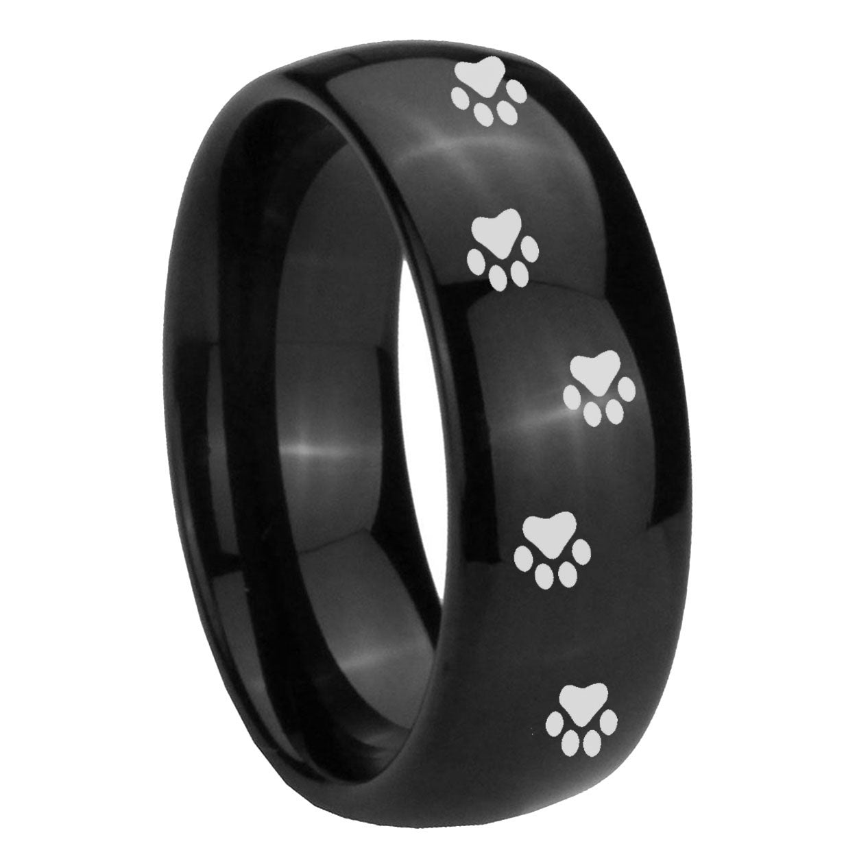 Intruding 5, 8mm Paw Print Dome Black Tungsten Carbide Wedding Bands Ring . Offer in both 5mm and 8mm band width polished black plated finished from size 4 to 14
