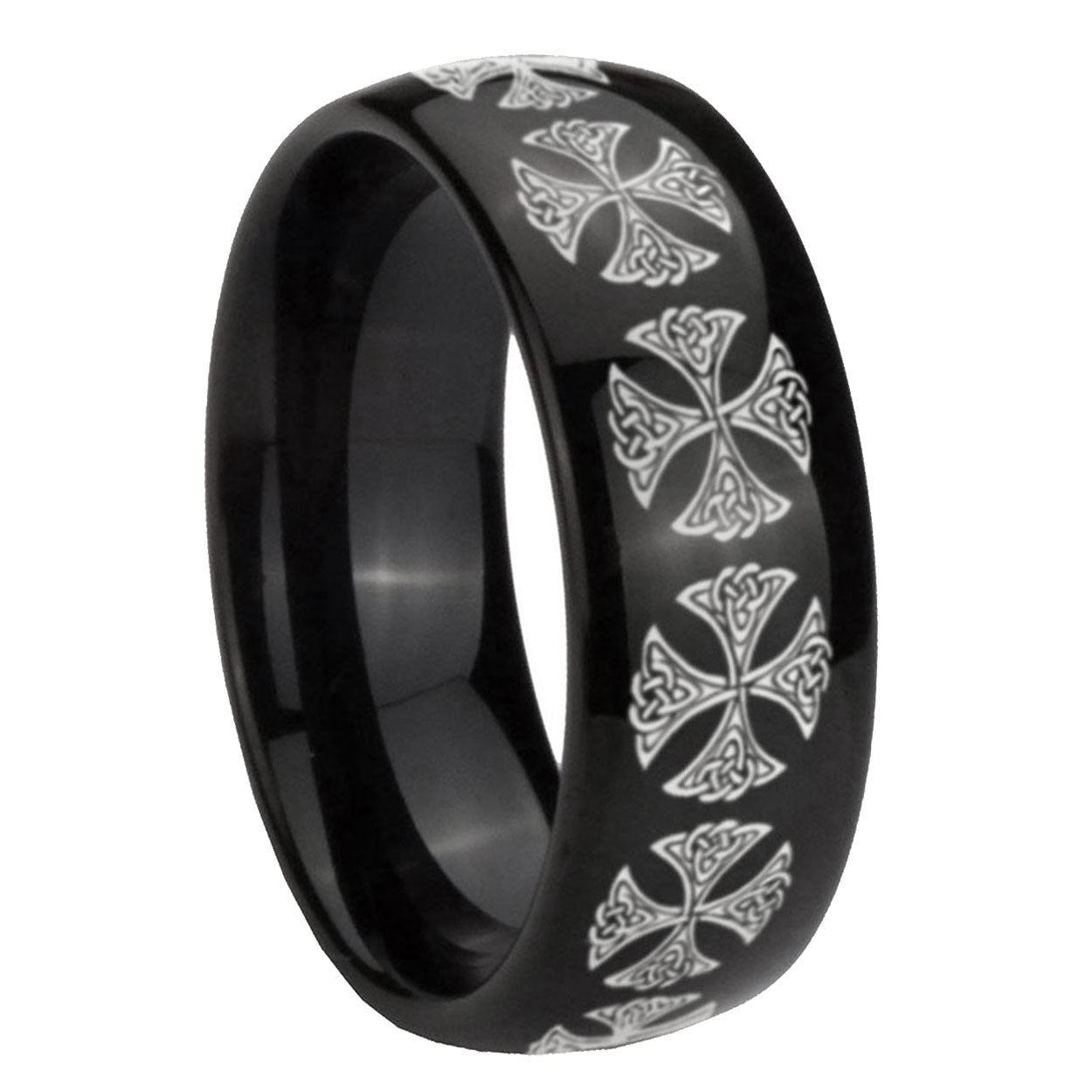 Intruding 5, 8mm Medieval Cross Dome Black Tungsten Carbide Mens Anniversary Ring . Offer in both 5mm and 8mm band width polished black plated finished from size 4 to 14