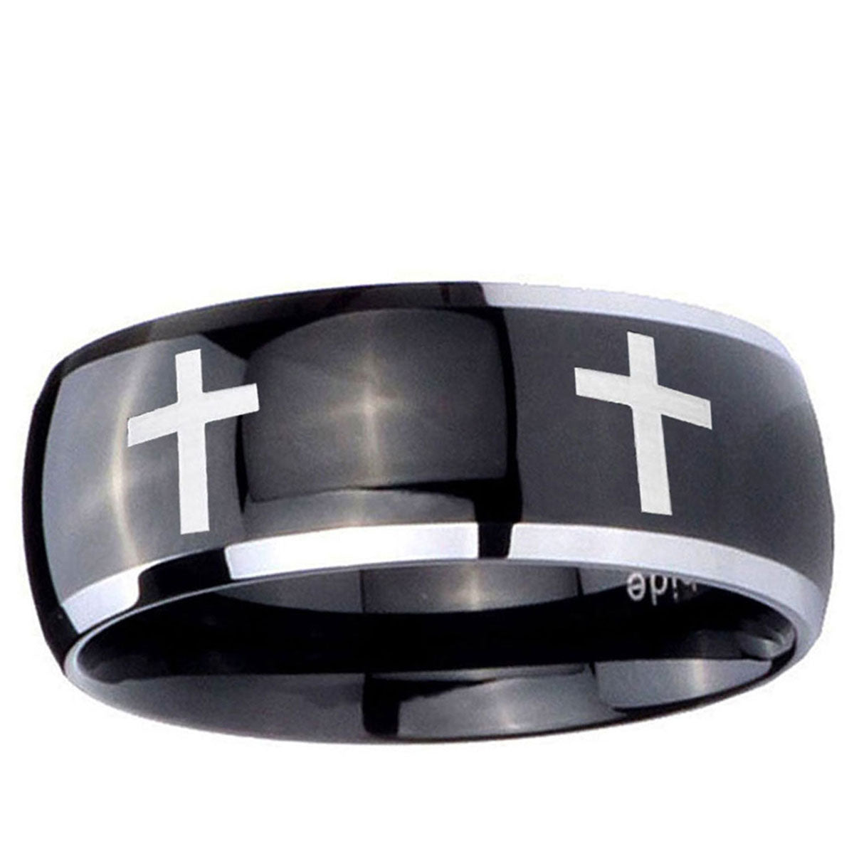 Intruding 5, 8mm Crosses Dome Glossy Black 2 Tone Tungsten Carbide Anniversary Ring . Offer in both 5mm and 8mm band width polished black plated two tone finished from size 4 to 14