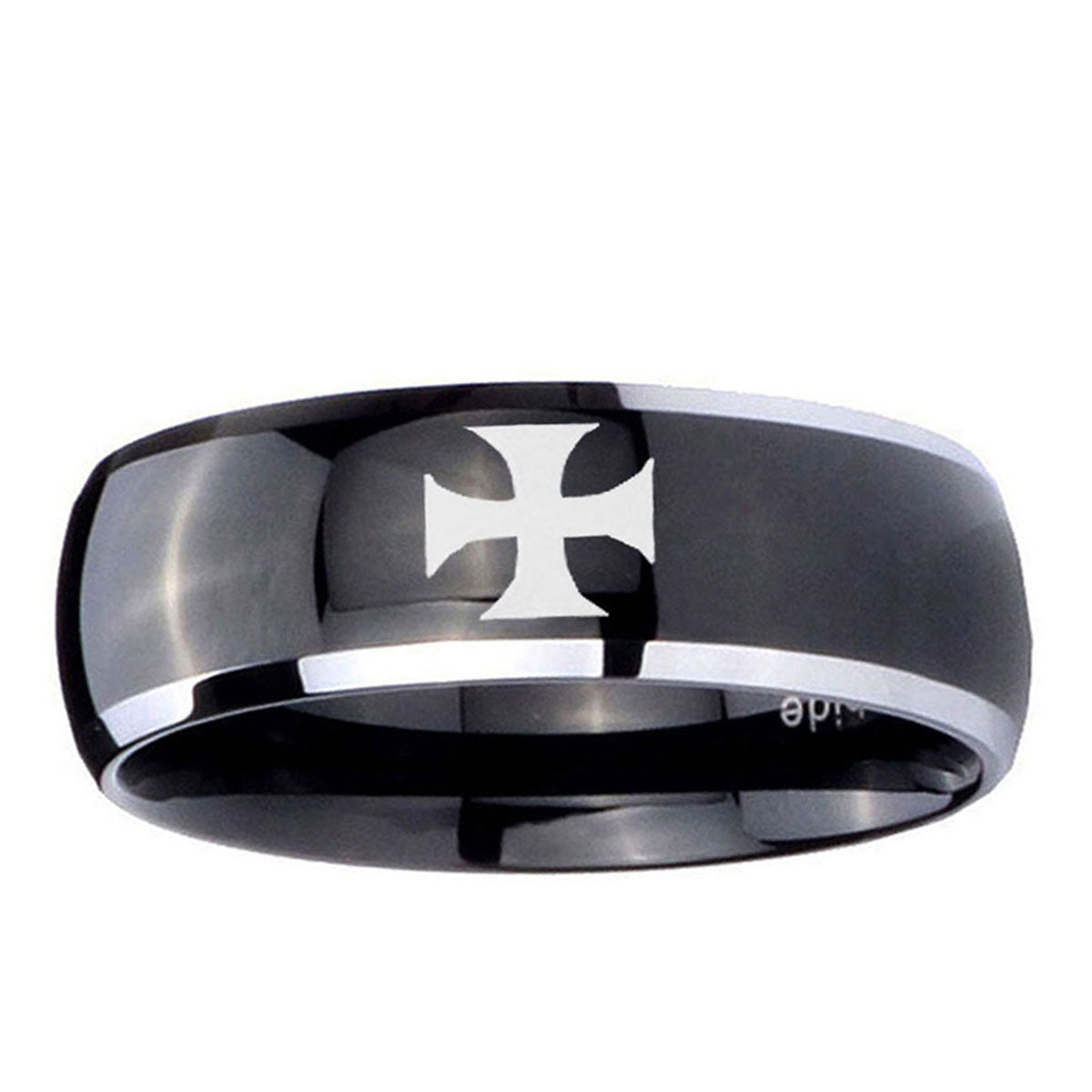 Intruding 5, 8mm Maltese Cross Dome Glossy Black 2 Tone Tungsten Carbide Anniversary Ring . Offer in both 5mm and 8mm band width polished black plated two tone finished from size 4 to 14