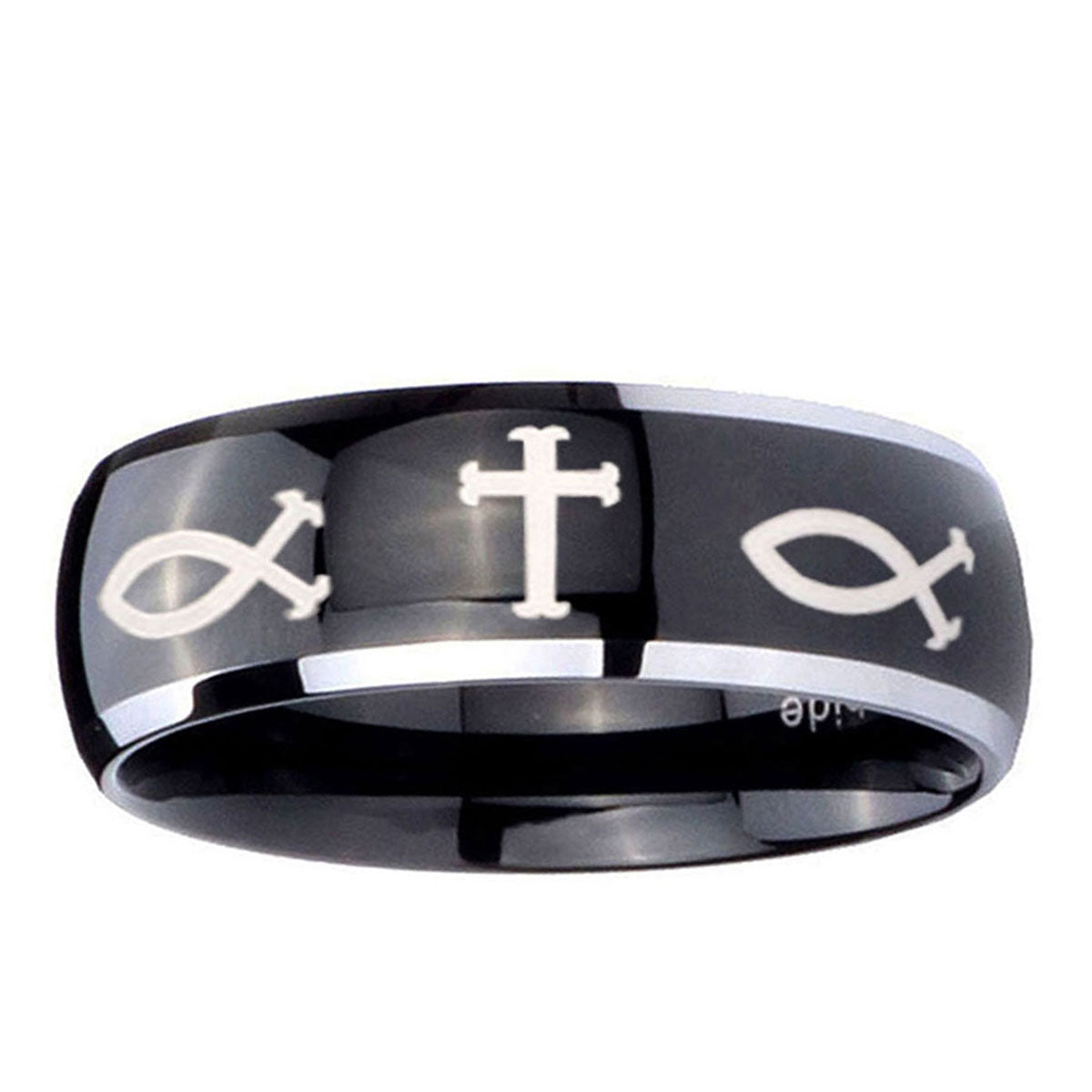 5, 8mm Fish & Cross Dome Glossy Black 2 Tone Tungsten Carbide Men's Wedding Ring