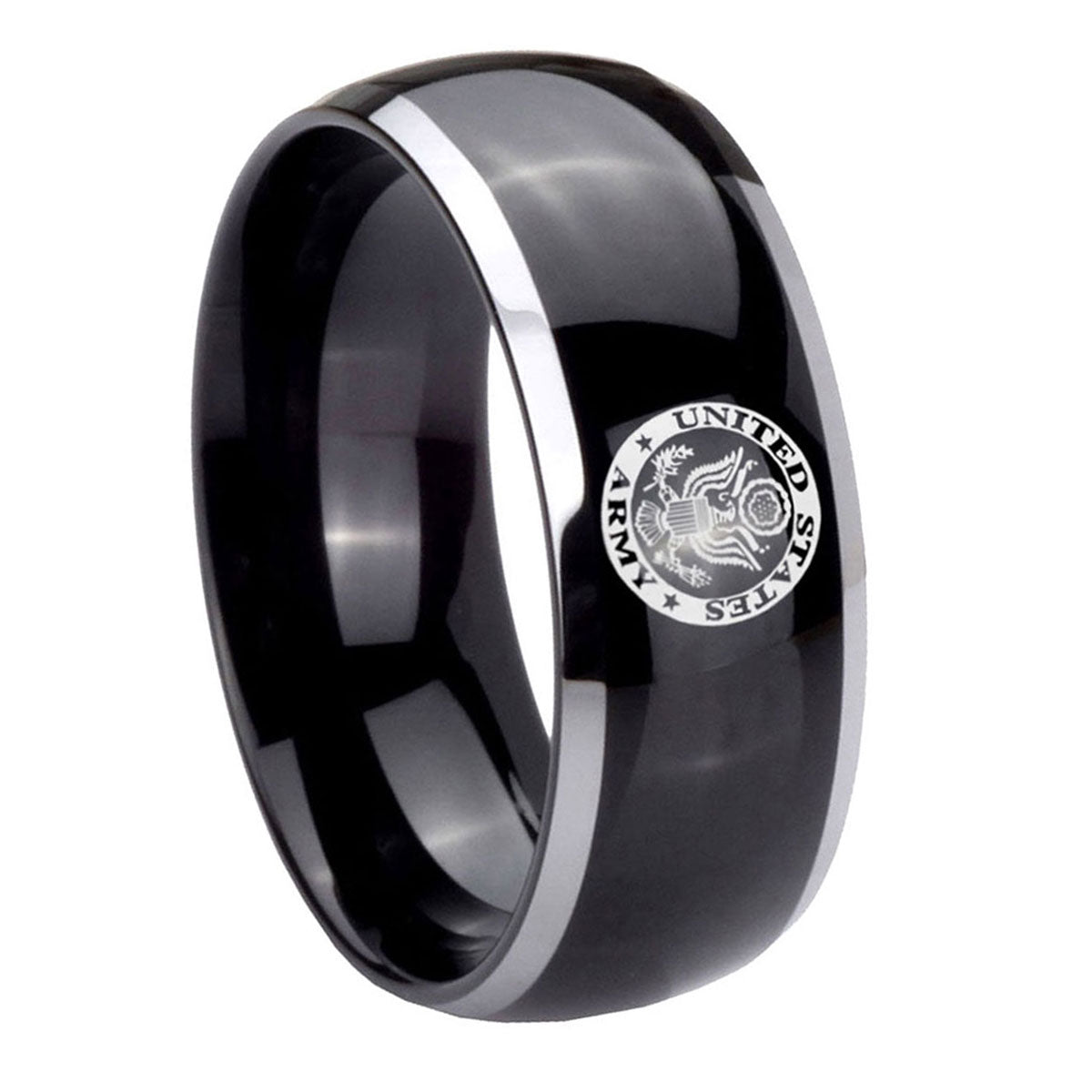 Intruding 5, 8mm U.S. Army Dome Glossy Black 2 Tone Tungsten Mens Wedding Ring . Offer in both 5mm and 8mm band width polished black plated two tone finished from size 4 to 14