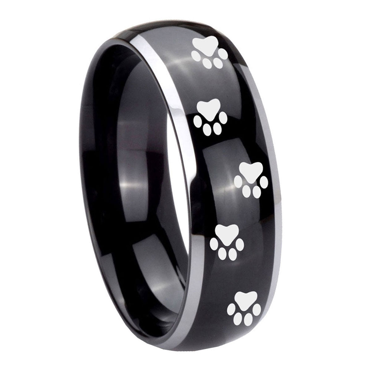 5, 8mm Paw Print Dome Glossy Black 2 Tone Tungsten Carbide Men's Wedding Band