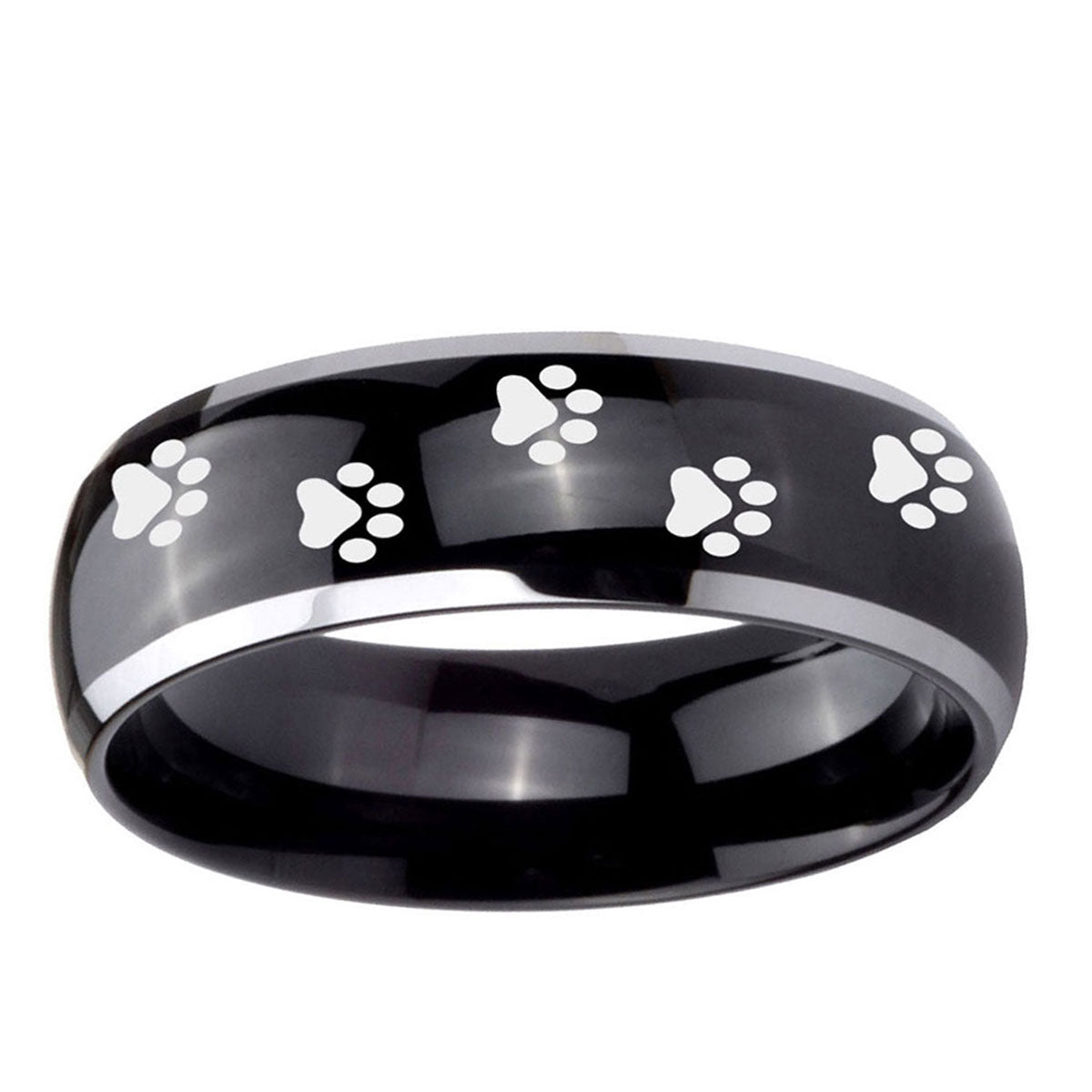 Intruding 5, 8mm Paw Print Dome Glossy Black 2 Tone Tungsten Carbide Men's Wedding Band . Offer in both 5mm and 8mm band width polished black plated two tone finished from size 4 to 14