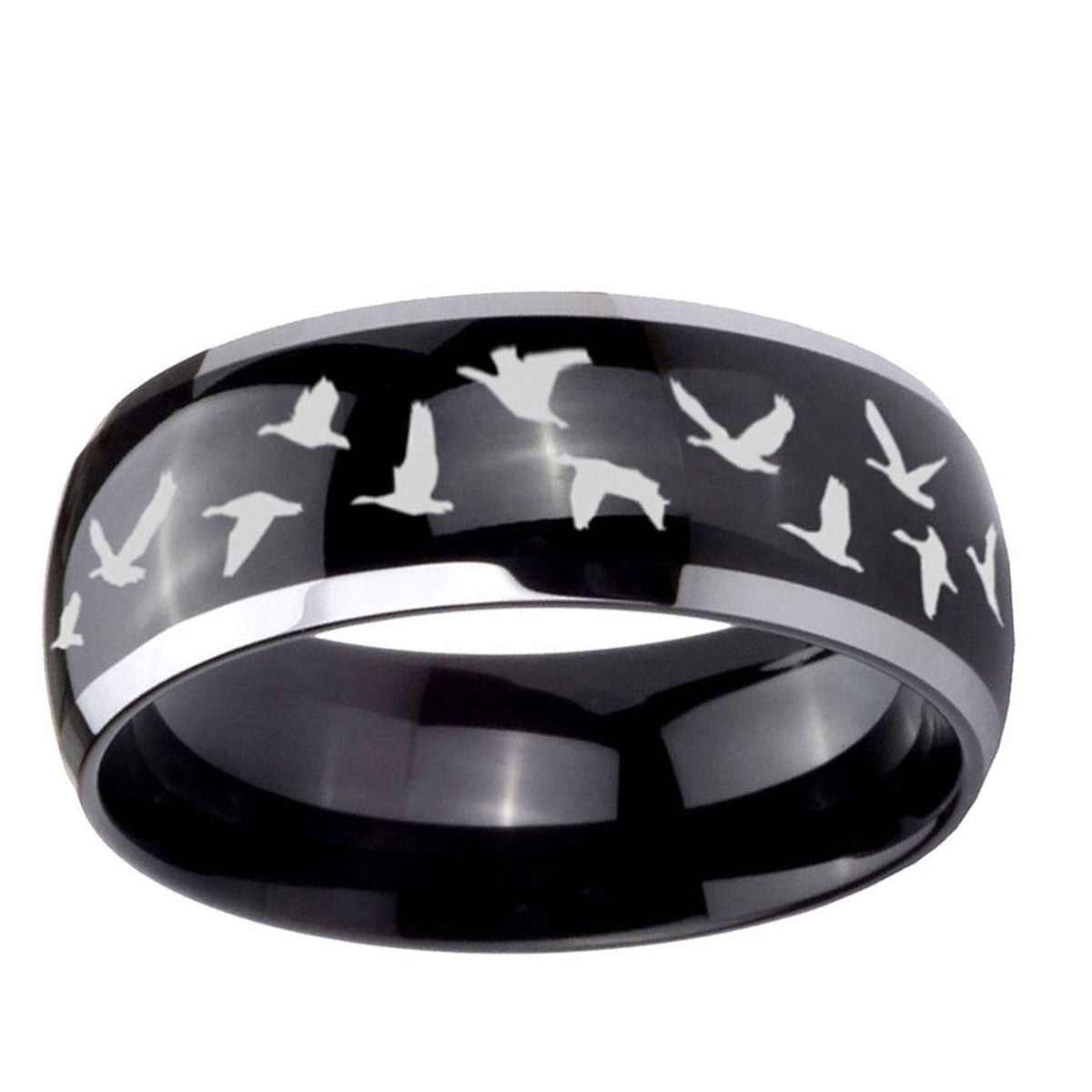 Intruding 5, 8mm Flying Geese Hunting Dome Glossy Black 2 Tone Tungsten Carbide Rings for Men . Offer in both 5mm and 8mm band width polished black plated two tone finished from size 4 to 14