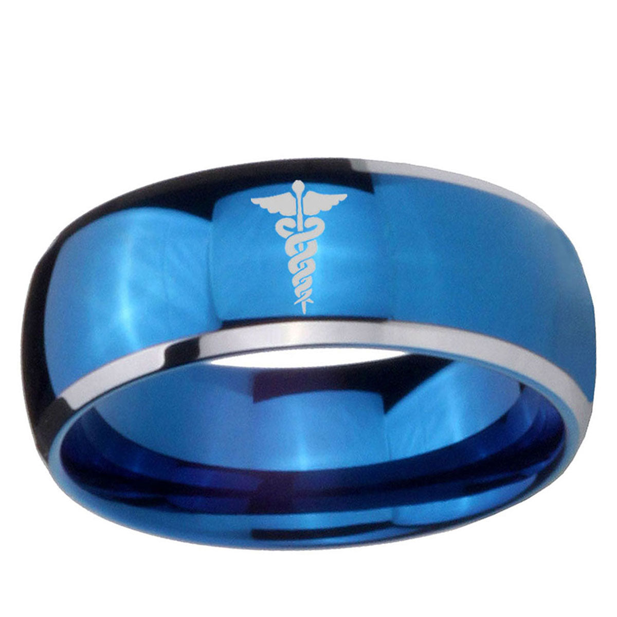 Intruding 5, 8mm Medical Symbol Dome Blue 2 Tone Tungsten Carbide Promise Ring . Offer in both 5mm and 8mm band width polished blue plated 2 tone finished from size 4 to 14
