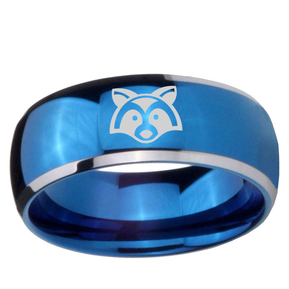 Intruding 5, 8mm Raccoon Animal Dome Blue 2 Tone Tungsten Carbide Promise Ring . Offer in both 5mm and 8mm band width polished blue plated 2 tone finished from size 4 to 14