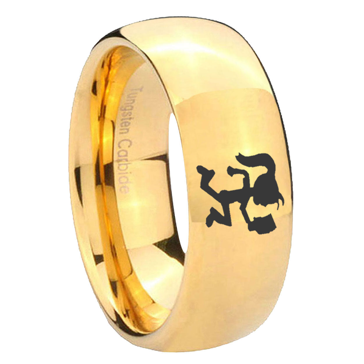 Intruding 5, 8mm Hatchet Woman Dome Gold Tungsten Carbide Anniversary Ring . Offer in both 5mm and 8mm band width polished 18k gold plated finished from size 4 to 14