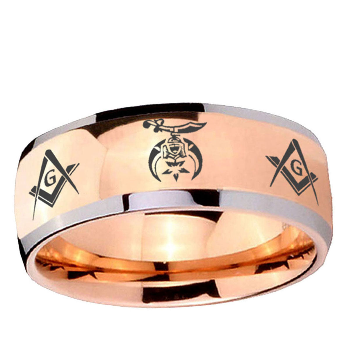 Intruding 5, 8mm Masonic Shriners Dome Rose Gold Tungsten Carbide Mens Ring . Offer in both 5mm and 8mm band width two tone rose gold plated finished from size 4 to 14