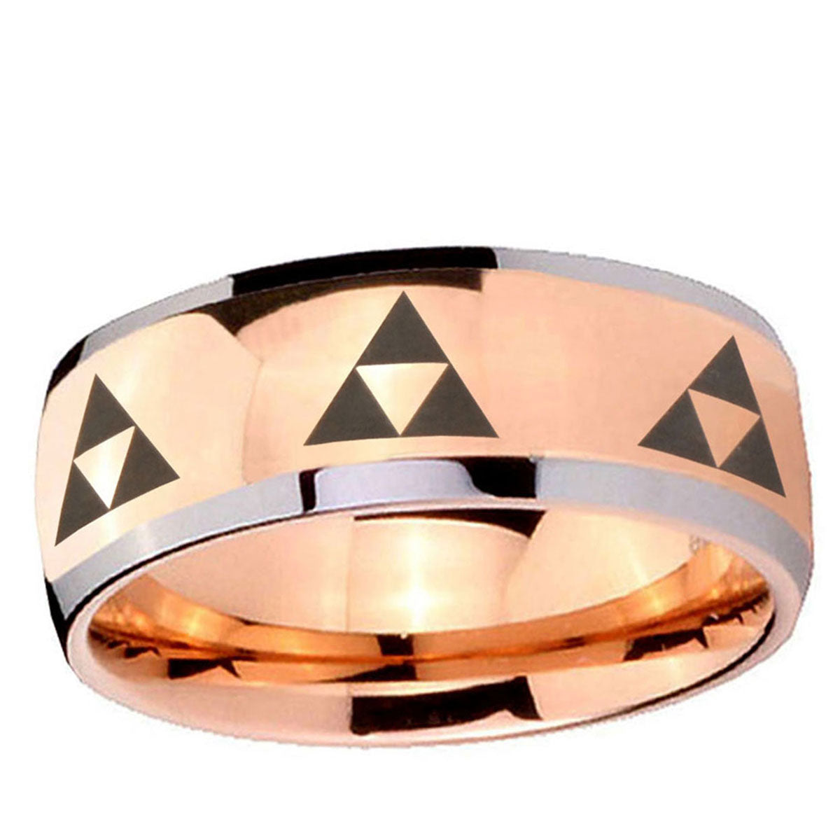 Intruding 5, 8mm Multiple Zelda Triforce Dome Rose Gold Tungsten Carbide Men's Ring . Offer in both 5mm and 8mm band width two tone rose gold plated finished from size 4 to 14