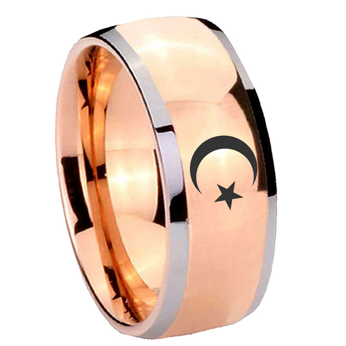 Intruding 5, 8mm Crescent Moon Stars Dome Rose Gold Tungsten Carbide Men's Ring . Offer in both 5mm and 8mm band width two tone rose gold plated finished from size 4 to 14