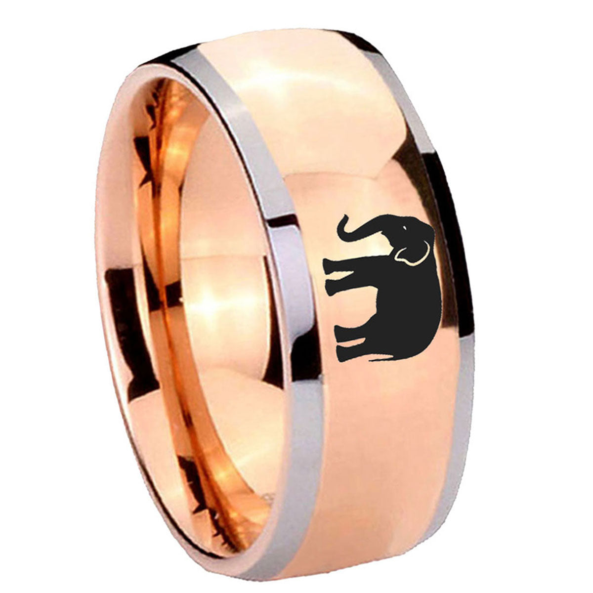 Intruding 5, 8mm Elephant Dome Rose Gold Tungsten Carbide Men's Ring . Offer in both 5mm and 8mm band width two tone rose gold plated finished from size 4 to 14