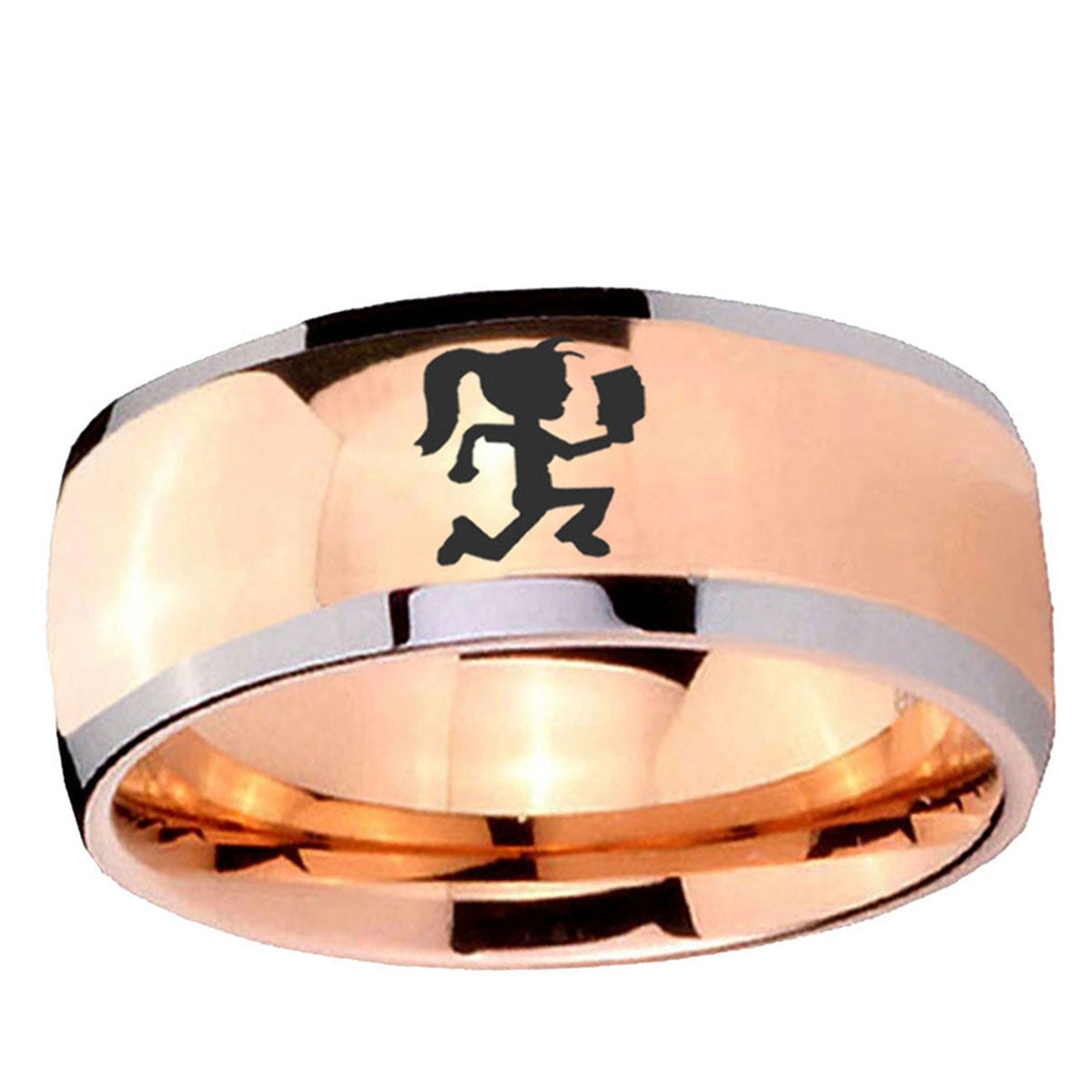 Intruding 5, 8mm Hatchet Woman Dome Rose Gold Tungsten Carbide Men's Ring . Offer in both 5mm and 8mm band width rose gold plated two tone finished from size 4 to 14