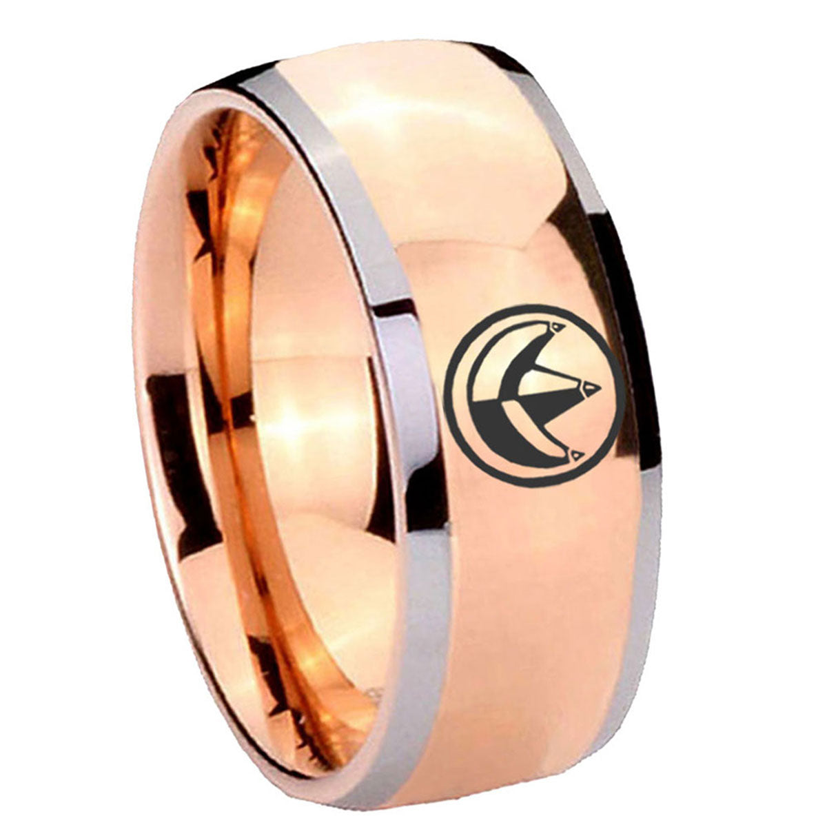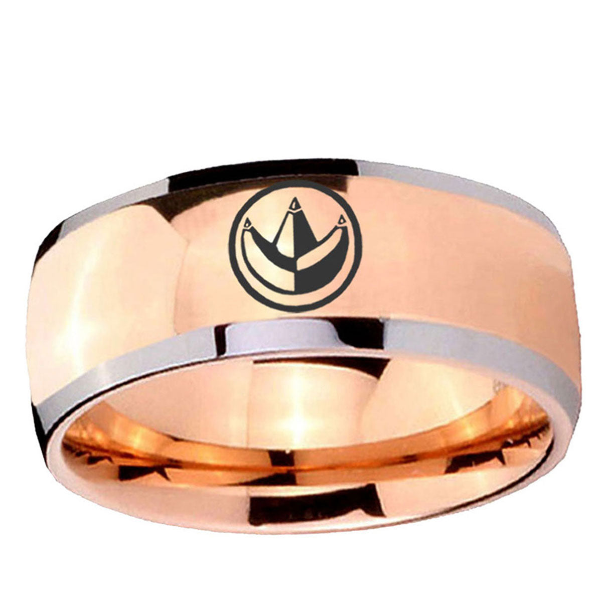 Intruding 5, 8mm Green Ranger Power Dome Rose Gold Tungsten Carbide Men's Ring . Offer in both 5mm and 8mm band width rose gold plated two tone finished from size 4 to 14