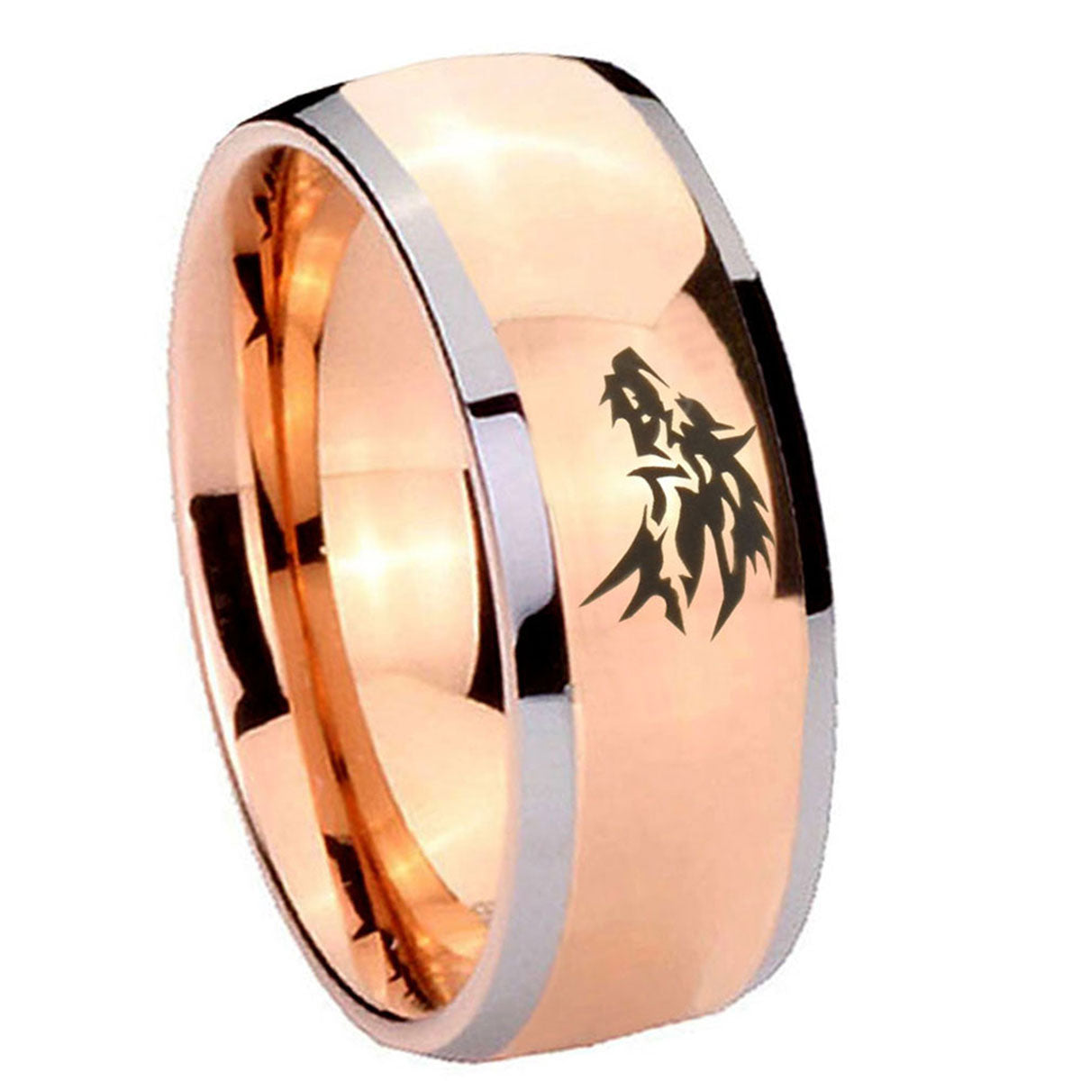 Intruding 5, 8mm Wolf Dome Rose Gold Tungsten Carbide Men's Promise Rings . Offer in both 5mm and 8mm band width rose gold plated two tone finished from size 4 to 14