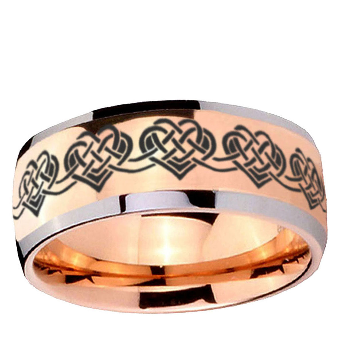 Intruding 5, 8mm Celtic Knot Heart Dome Rose Gold Tungsten Carbide Custom Mens Ring . Offer in both 5mm and 8mm band width two tone rose gold plated finished from size 4 to 14
