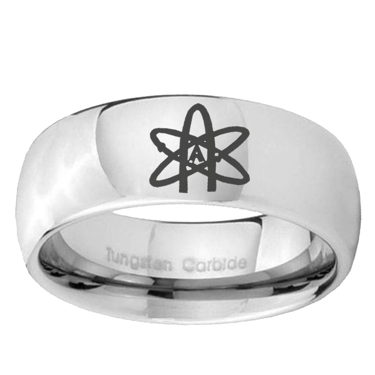 Intruding 5, 8mm American Atheist Mirror Dome Tungsten Carbide Mens Anniversary Ring . Offer in both 5mm and 8mm band width polished silver finished from size 4 to 14