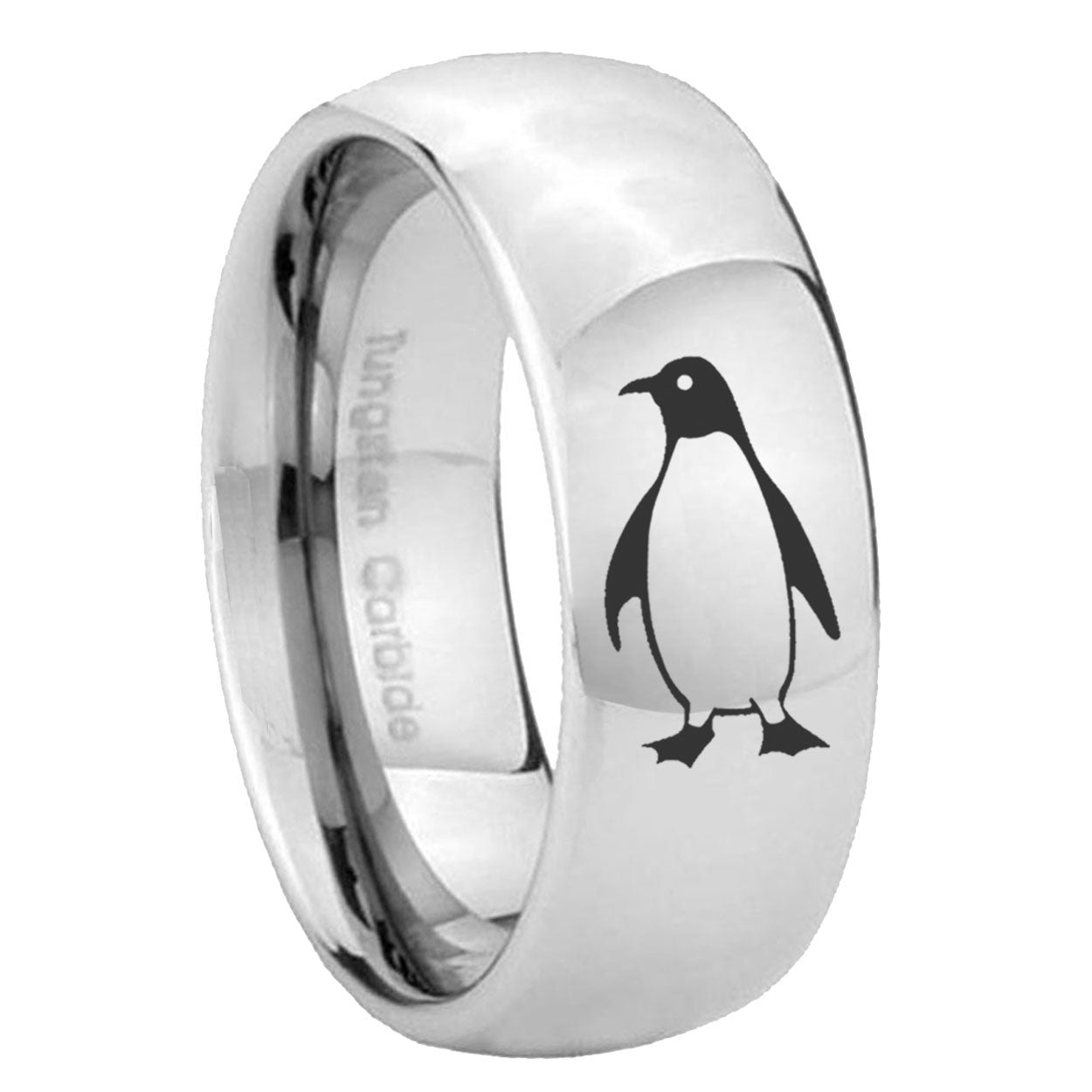 Intruding 5, 8mm Penguin Mirror Dome Tungsten Carbide Mens Ring Engraved . Offer in both 5mm and 8mm band width polished silver finished from size 4 to 14