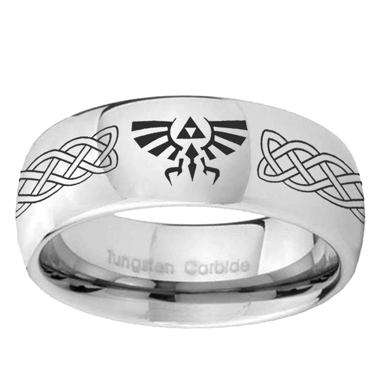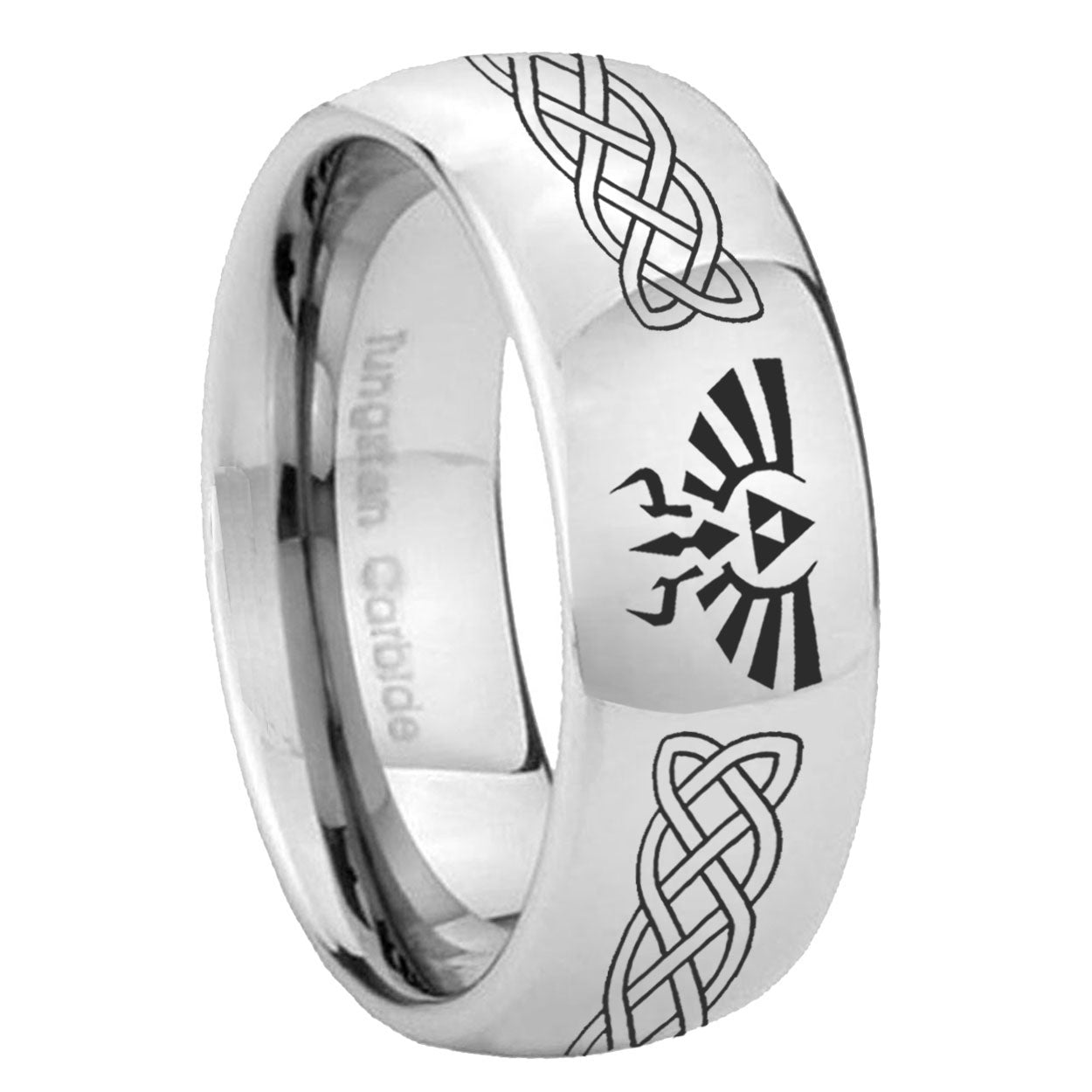 Intruding 5, 8mm Celtic Zelda Mirror Dome Tungsten Carbide Custom Ring for Men . Offer in both 5mm and 8mm band width polished silver finished from size 4 to 14