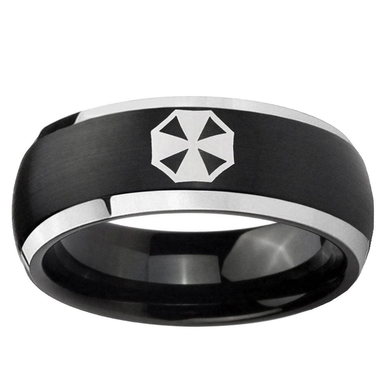 Intruding 5, 8mm Resident Evil Dome Brushed Black 2 Tone Tungsten Carbide Personalized Ring . Offer in both 5mm and 8mm band width brushed black plated finished from size 4 to 14