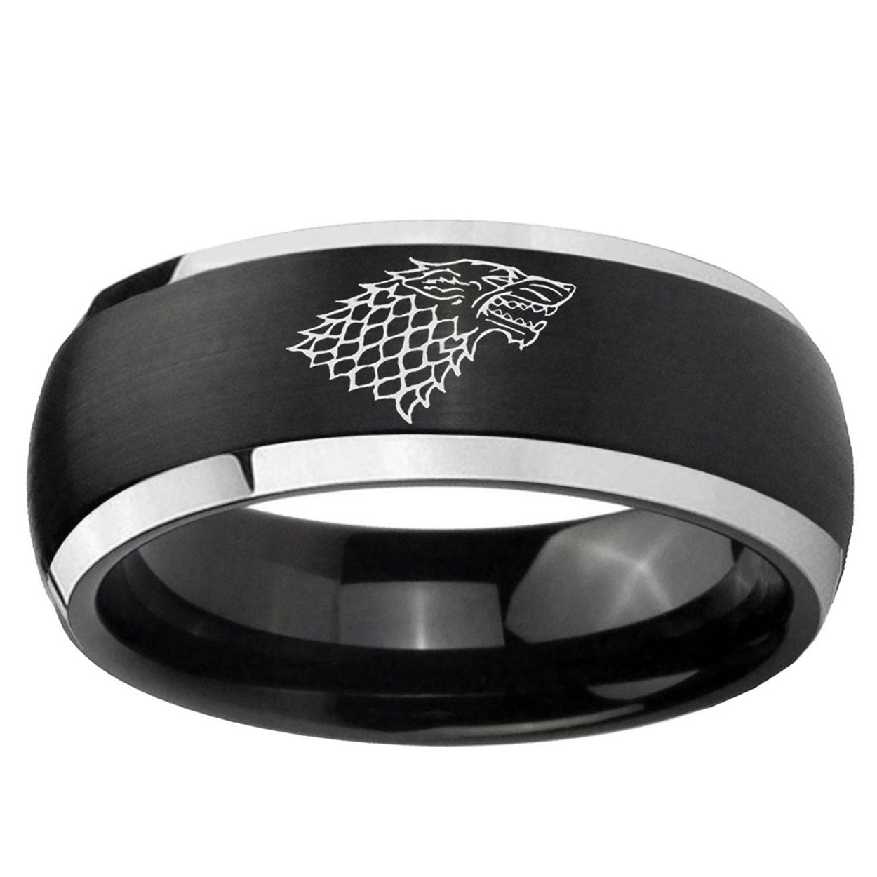 Intruding 5, 8mm Game Of Thrones House Stark Direwolf Dome Brushed Black 2 Tone Tungsten Personalized Ring . Offer in both 5mm and 8mm band width brushed black plated finished from size 4 to 14