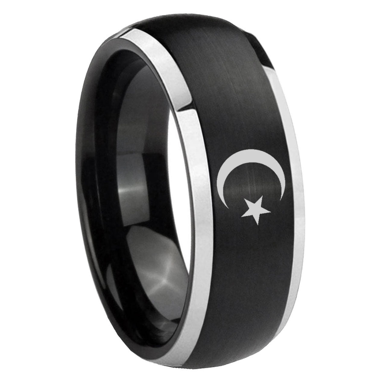 5, 8mm Crescent Moon Stars Dome Brushed Black 2 Tone Tungsten Personalized Ring