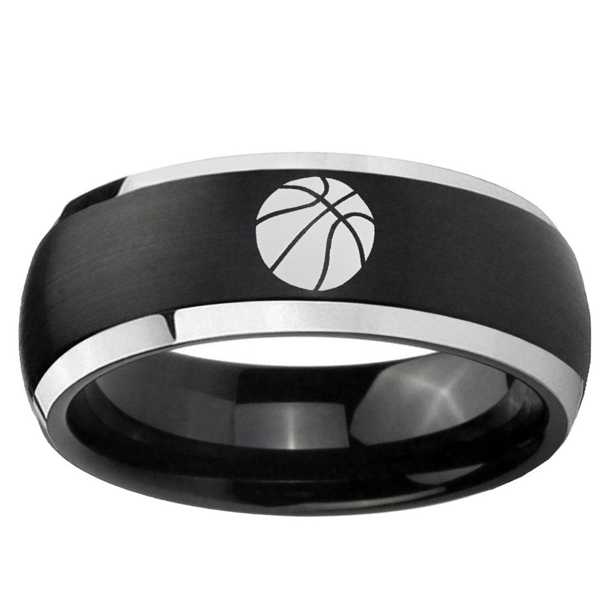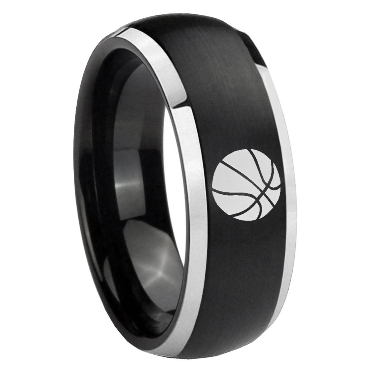 Intruding 5, 8mm Basketball Dome Brushed Black 2 Tone Tungsten Carbide Anniversary Ring . Offer in both 5mm and 8mm band width brushed black plated finished from size 4 to 14