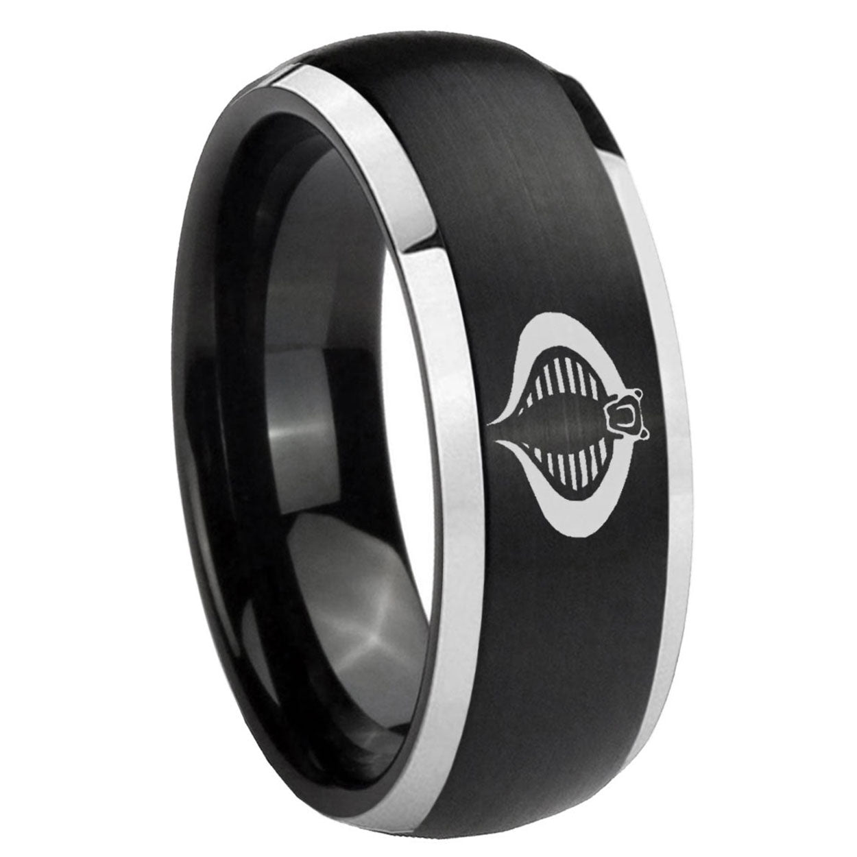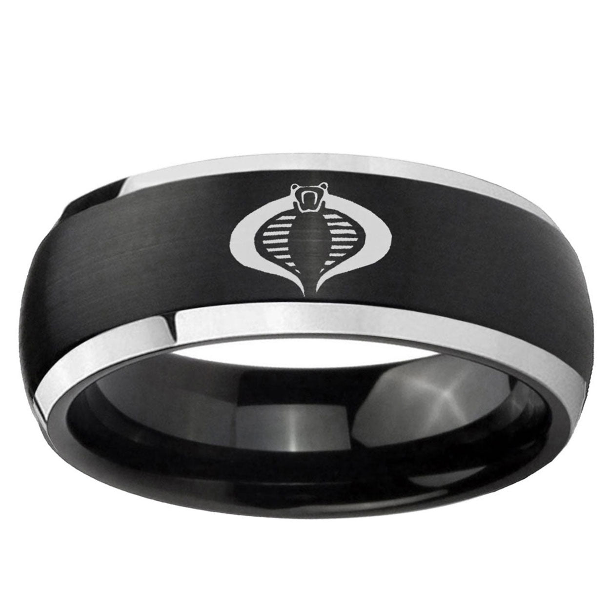 Intruding 5, 8mm Cobra Dome Brushed Black 2 Tone Tungsten Carbide Men's Wedding Ring . Offer in both 5mm and 8mm band width brushed black plated finished from size 4 to 14