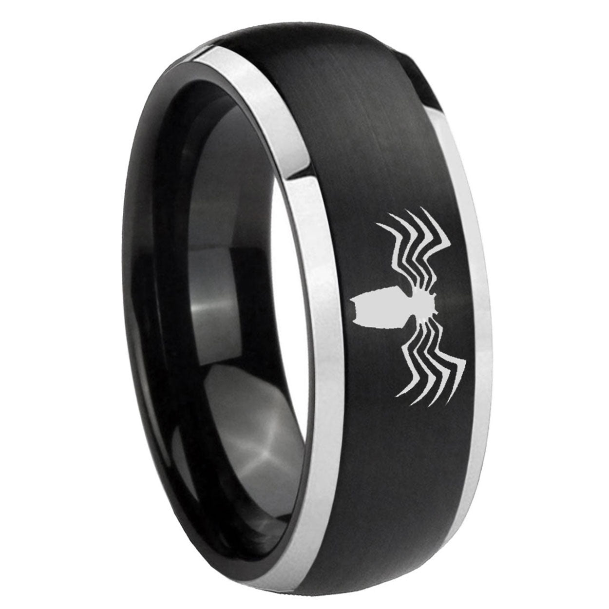 Intruding 5, 8mm Spider Dome Brushed Black 2 Tone Tungsten Carbide Mens Ring Engraved . Offer in both 5mm and 8mm band width brushed black plated finished from size 4 to 14